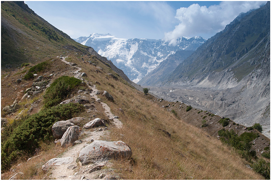 Очень сильно. Фотографии Морица Деши есть в открытом доступе, их можно посмотреть. Они сняты 135 лет назад. Разница колоссальная. Я здесь в первый раз лет в 7-10 был, у меня в памяти осталось, что на мосту (прим. ред. — мост под лагерем) можно было видеть, как Черек Безенгийский вытекает из ледникового грота. В начале 90-х мы ходили чуть ли не по прямой до Миссес-коша, никаких проблем не было потом спуститься и вернуться через карман ледника. Сейчас же не каждого туда отправишь. Там когда-то действительно кош был, крупный рогатый скот держали, коров доили. Пока ледник не отступил, по морене была прямая тропа.