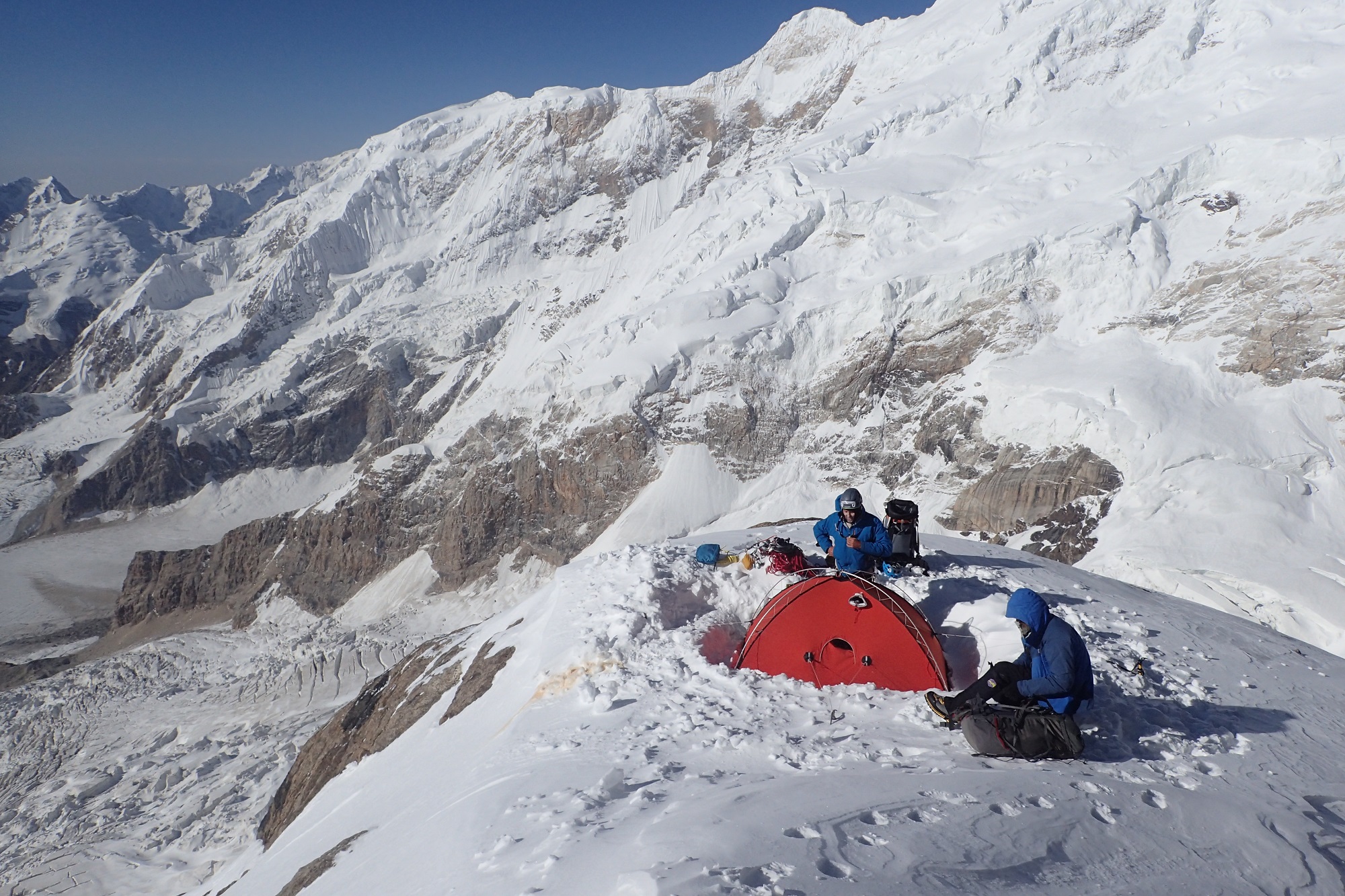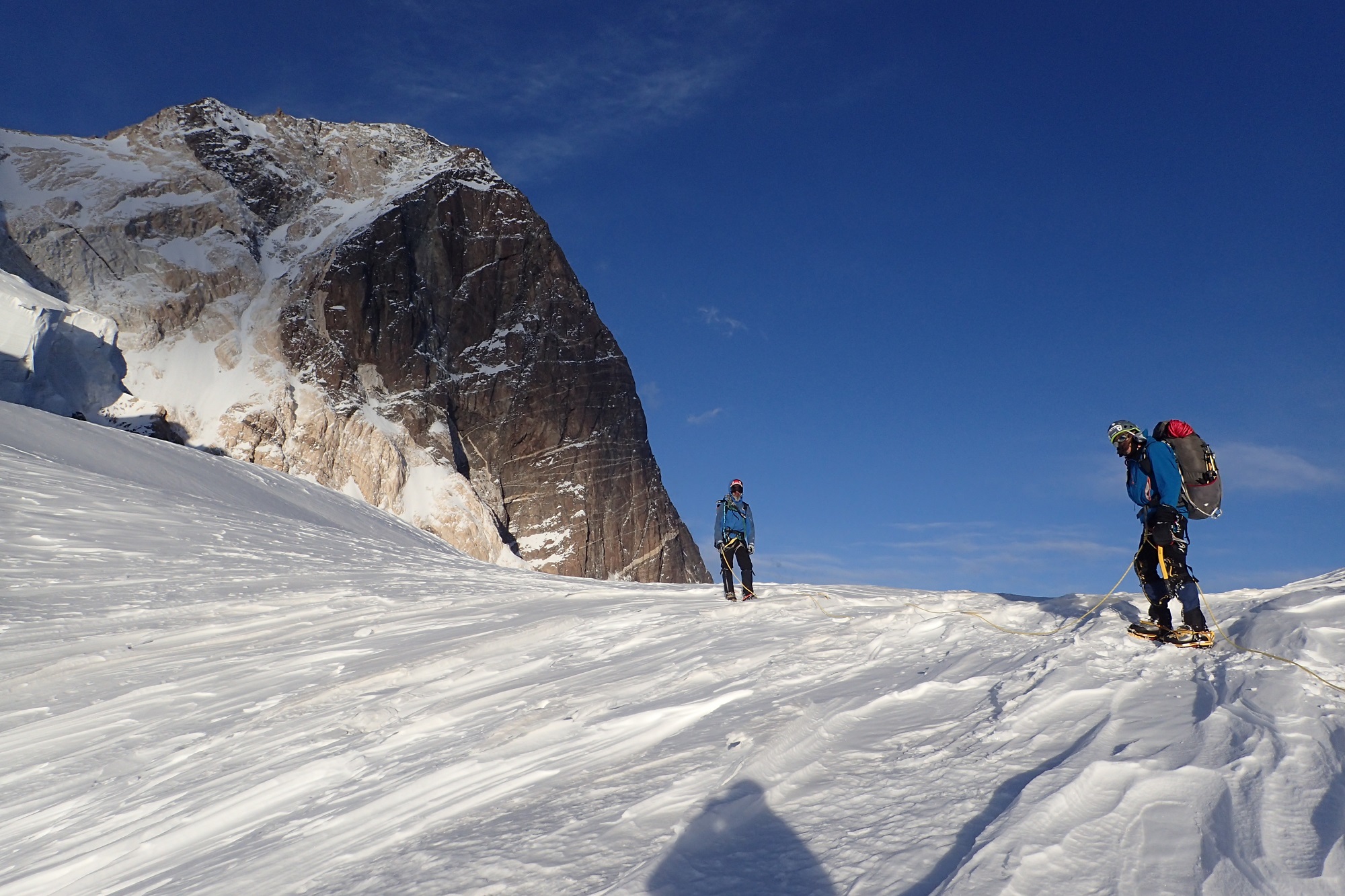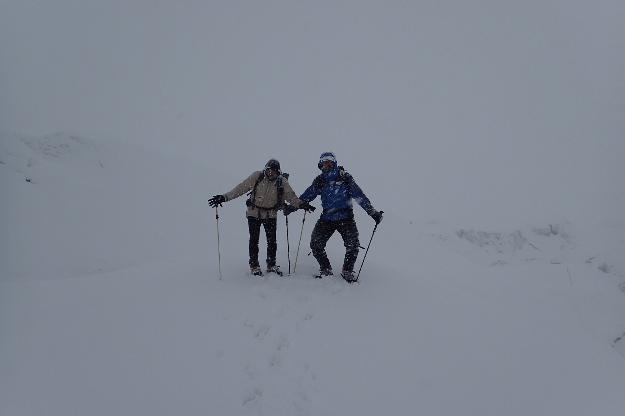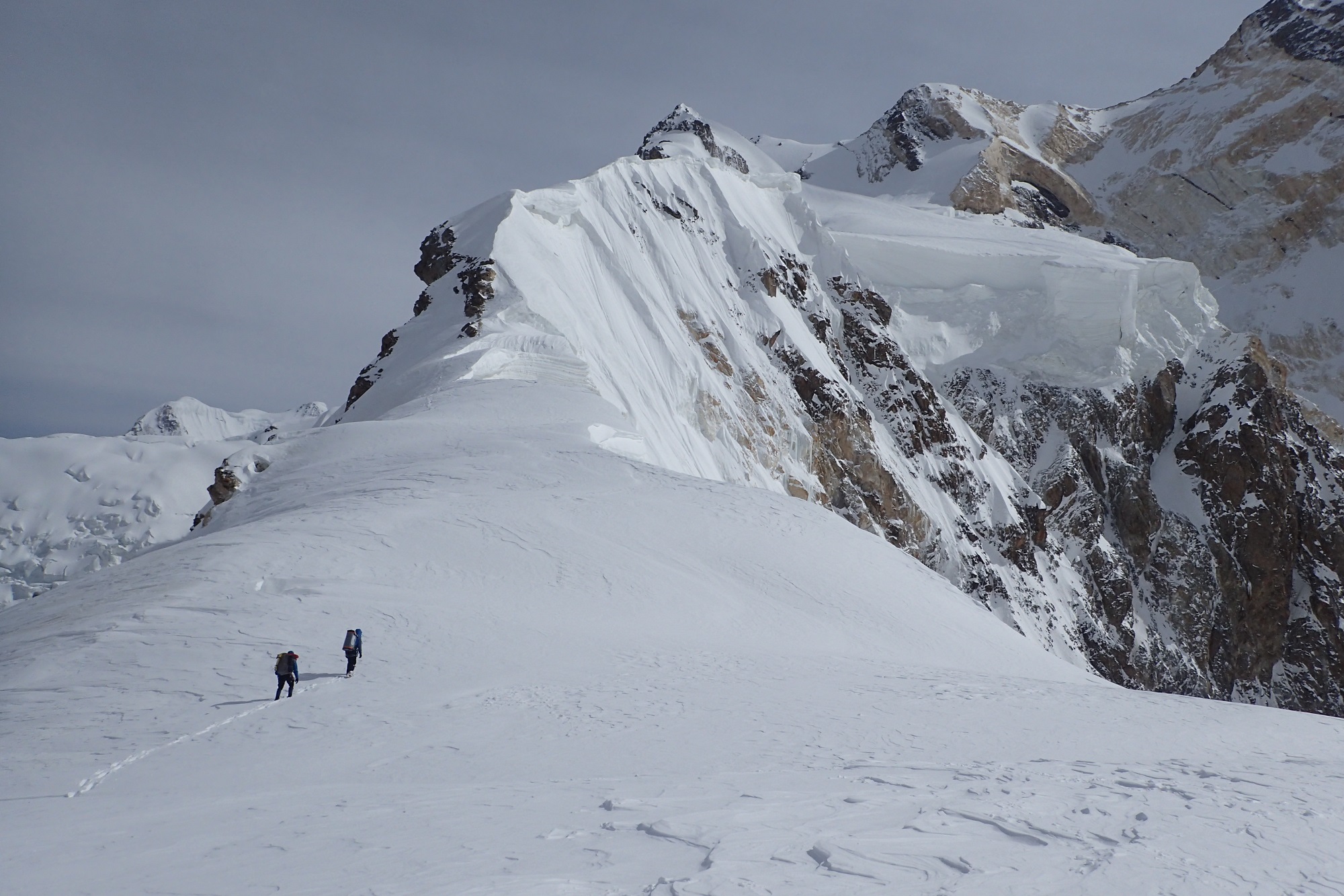 Разная, пятьдесят на пятьдесят. Вообще, из-за того, что две больших горы рядом, там все время дует. Через перевал, вдоль южной стены постоянно очень сильный ветер. Основная непогода пришлась на длинный спуск. Какое-то время ты идешь по ребру и ориентироваться не обязательно, видимость не очень нужна. А потом, когда надо спускаться на перевал, видимость крайне важна. Снег, облака очень сильно мешали. Последние два дня на спуске вообще не было видно, куда идти. Тогда мы просто садились и ждали, пока раздует. Один раз почти час так просидели, только потом увидели направление и пошли.