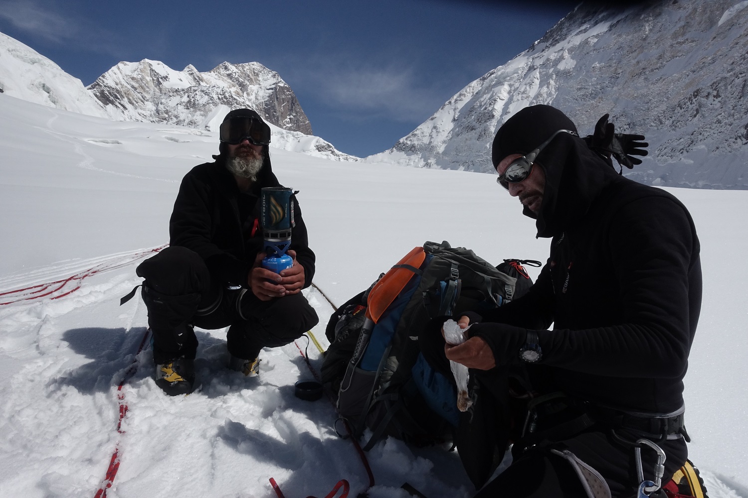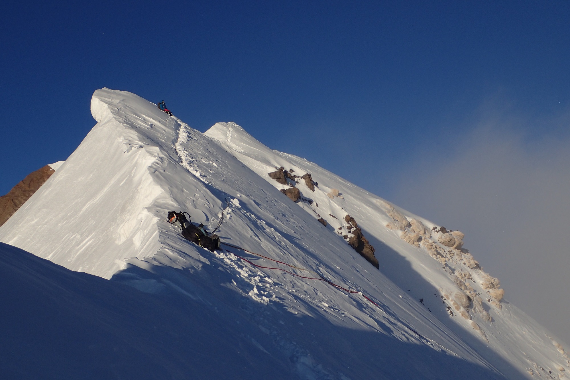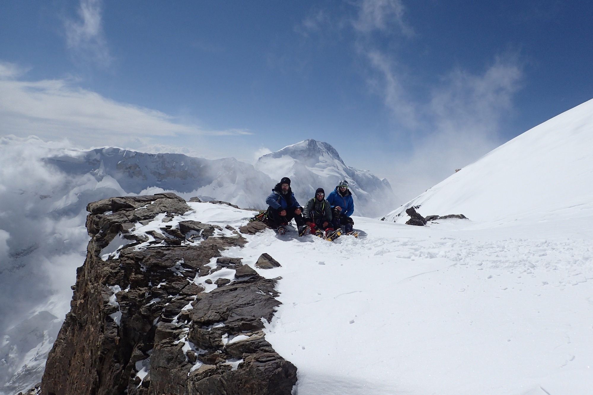 Разная, пятьдесят на пятьдесят. Вообще, из-за того, что две больших горы рядом, там все время дует. Через перевал, вдоль южной стены постоянно очень сильный ветер. Основная непогода пришлась на длинный спуск. Какое-то время ты идешь по ребру и ориентироваться не обязательно, видимость не очень нужна. А потом, когда надо спускаться на перевал, видимость крайне важна. Снег, облака очень сильно мешали. Последние два дня на спуске вообще не было видно, куда идти. Тогда мы просто садились и ждали, пока раздует. Один раз почти час так просидели, только потом увидели направление и пошли.