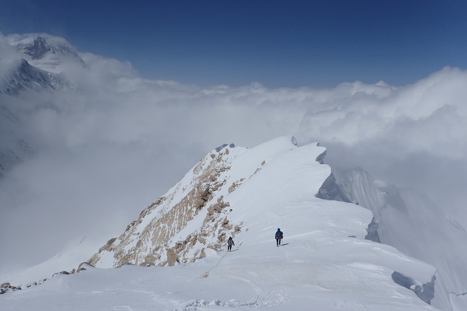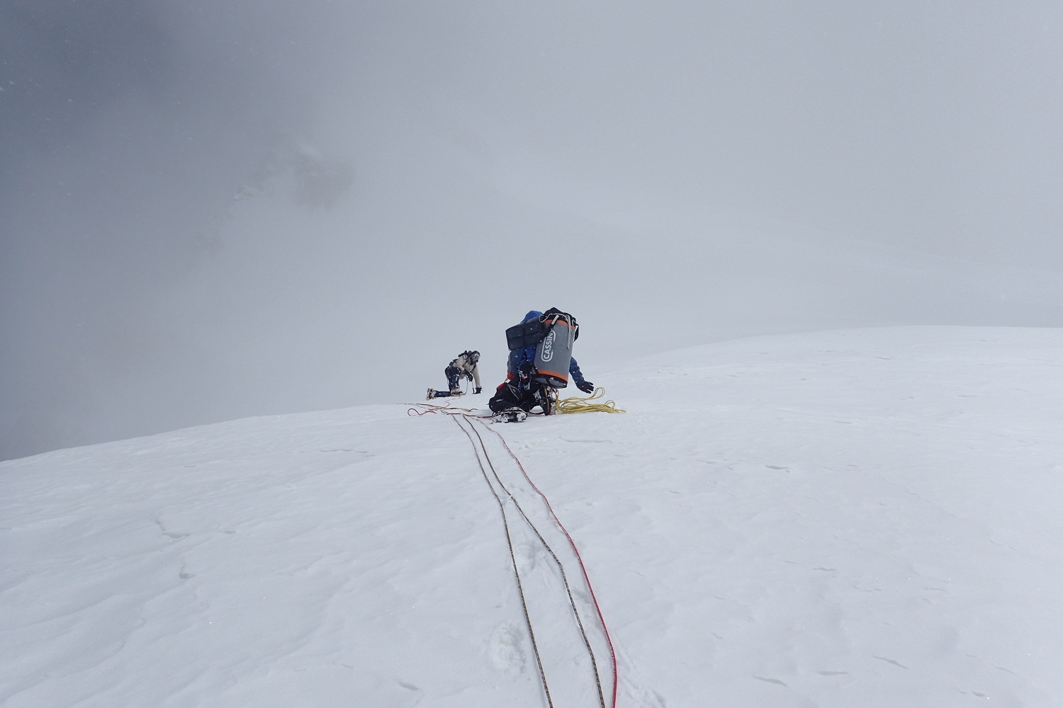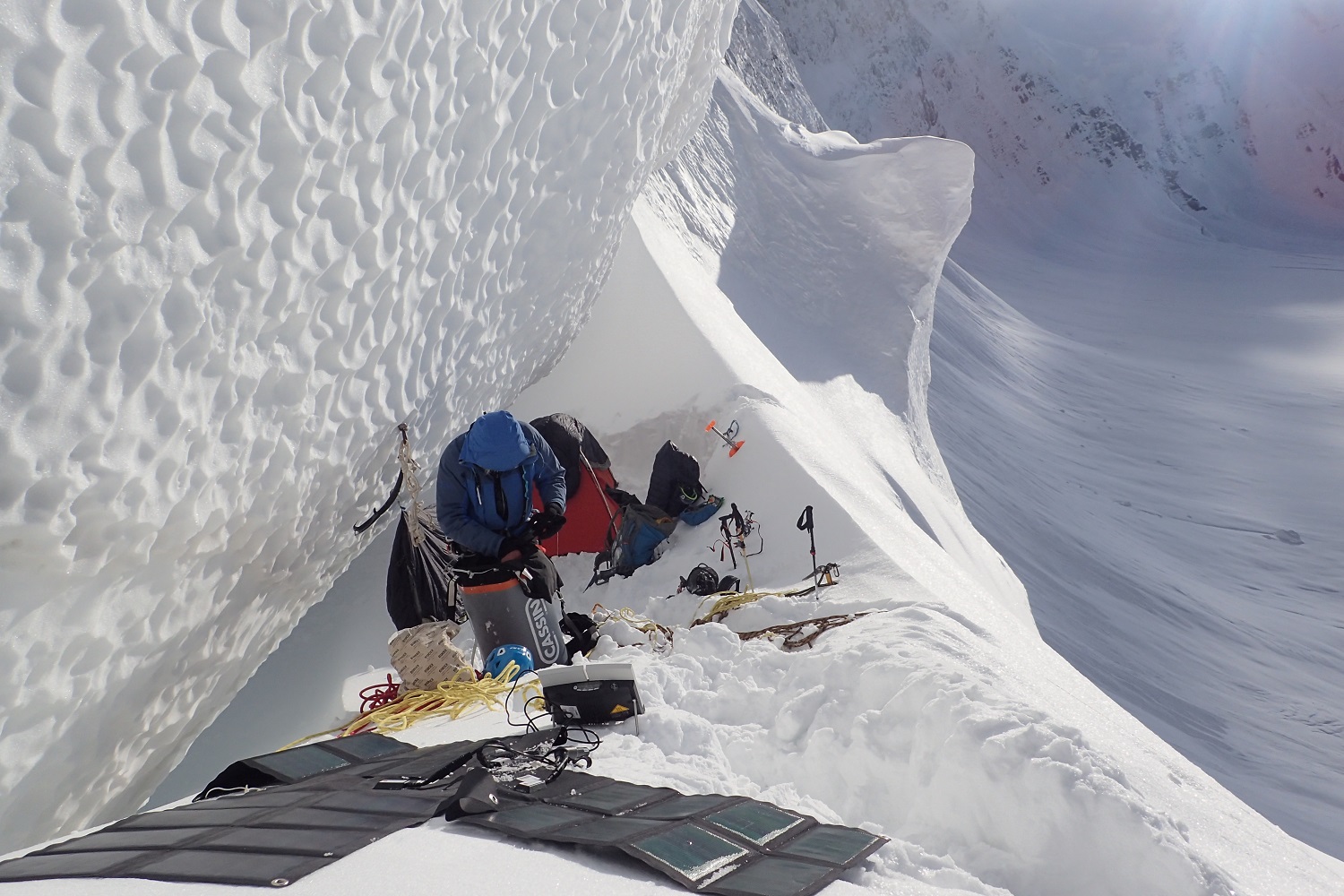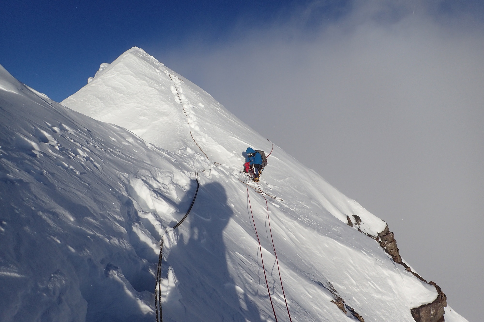 Разная, пятьдесят на пятьдесят. Вообще, из-за того, что две больших горы рядом, там все время дует. Через перевал, вдоль южной стены постоянно очень сильный ветер. Основная непогода пришлась на длинный спуск. Какое-то время ты идешь по ребру и ориентироваться не обязательно, видимость не очень нужна. А потом, когда надо спускаться на перевал, видимость крайне важна. Снег, облака очень сильно мешали. Последние два дня на спуске вообще не было видно, куда идти. Тогда мы просто садились и ждали, пока раздует. Один раз почти час так просидели, только потом увидели направление и пошли.