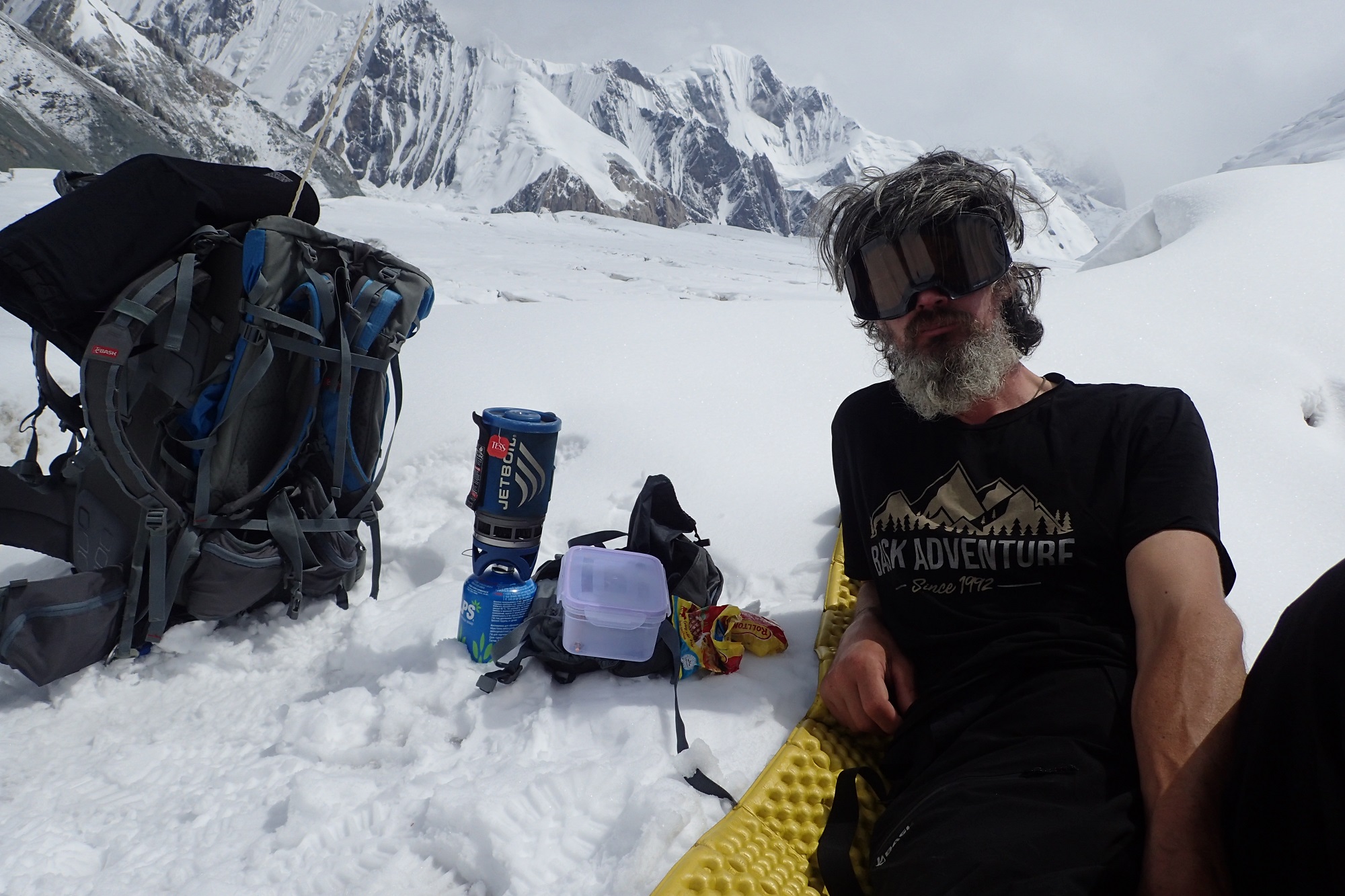 Классные новые пуховки BASK ASGARD. У нас была такая одна на троих из соображений экономии веса. На Жанну у нас были бесшовные пуховки BASK CHAMONIX PRO – нам очень они понравились, мы их взяли как проверенный вариант. А ASGARD взяли как полу-запасной вариант – утепляли ею все места, в которые было жалко положить основную одежду. Ее бросали в самые холодные и мокрые места в палатке, когда конденсат подмачивал часть вещей. Круто, что она не мокнет. Влагостойкий пух – это просто супер, – легко, практично, еще и ткань не промокает, не набирает влагу. ASGARD в этот раз – №1 для нас, очень понравилась.