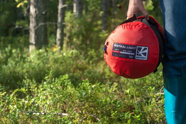 Пуховые мешки имеют лучшее соотношение вес/тепло и компактно сжимаются, но проигрывают во влажных условиях: намокший пух хуже греет и долго сохнет. Синтетика слабее по теплу и тяжелее, зато сохраняет свойства при намокании и проще в уходе. Для сравнения: пуховый спальный мешок BASK HALO LIGHT в размере M весит 661 г, а спальник с синтетическим наполнителем BASK MISTRAL LIGHT в том же размере и со схожими температурными характеристиками — 1190 г. Ориентироваться на вес нужно, но важнее другое правило: в сухих и холодных регионах (горы, зимние походы) предпочтительнее пух, в сырых условиях — синтетика.