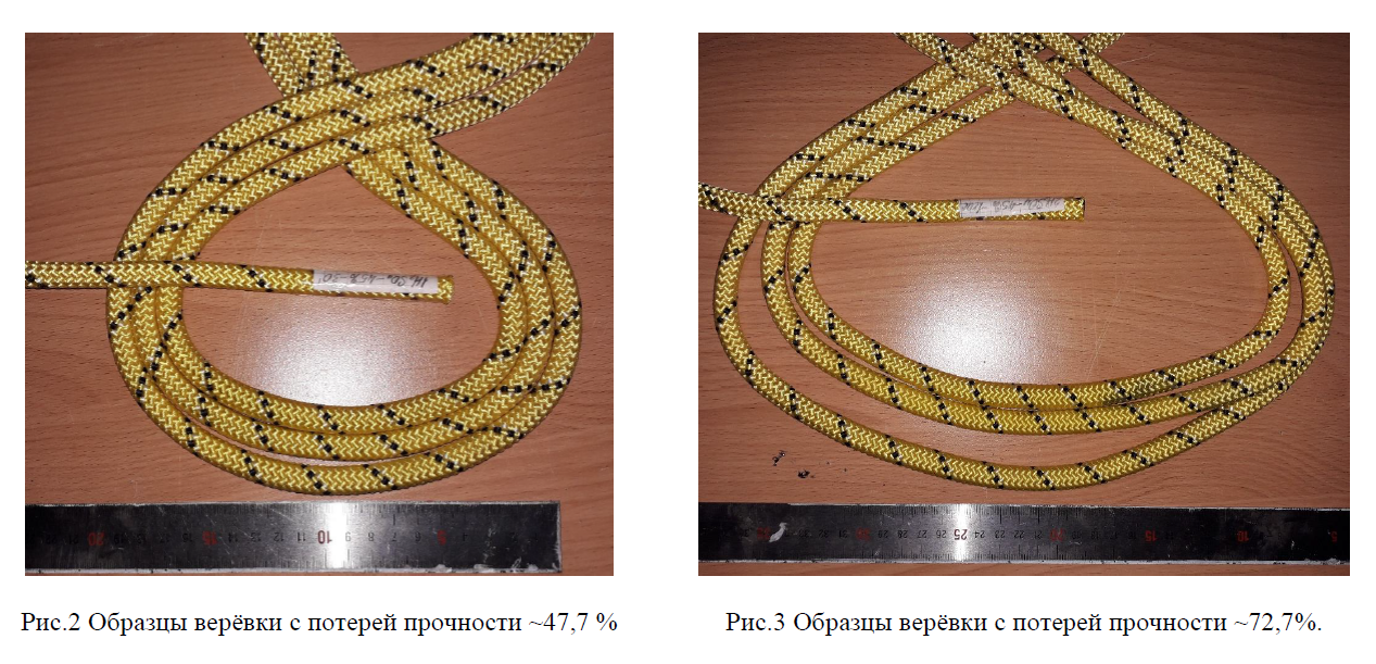 Широко используемые на практике статические верёвки диаметром 10 мм, соответствующие требованиям ГОСТ EN 1891-2014 тип А. С целью обеспечения возможности сравнения полученных результатов, для проведения всех испытаний использовалась только новая верёвка одной партии, полученная непосредственно с завода-изготовителя.