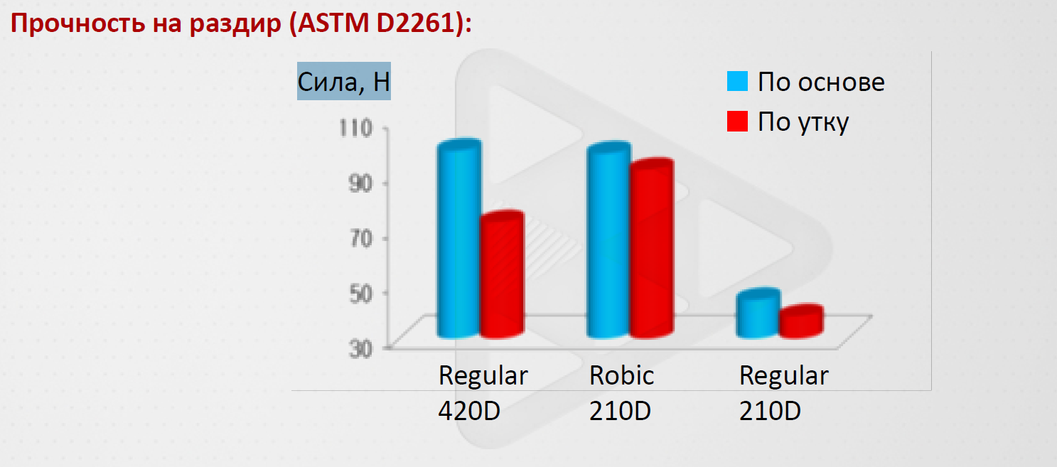 Пропитка UTS: аббревиатура расшифровывается как «Ultra Tearing Strength» (сверхвысокое сопротивление разрыву). Производится она из полисилоксанов. Пропитка существенно улучшает свойства ткани - увеличивается прочность на разрыв, меньше скользит, не пахнет и меньше пачкается.Сотрудники компании-производителя ткани приводят результаты тестов, проведенных в соответствии со стандартом ASTM D2261: