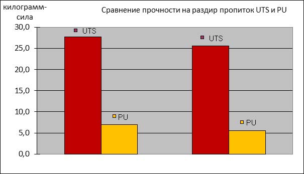 Пропитка UTS: аббревиатура расшифровывается как «Ultra Tearing Strength» (сверхвысокое сопротивление разрыву). Производится она из полисилоксанов. Пропитка существенно улучшает свойства ткани - увеличивается прочность на разрыв, меньше скользит, не пахнет и меньше пачкается.Сотрудники компании-производителя ткани приводят результаты тестов, проведенных в соответствии со стандартом ASTM D2261: