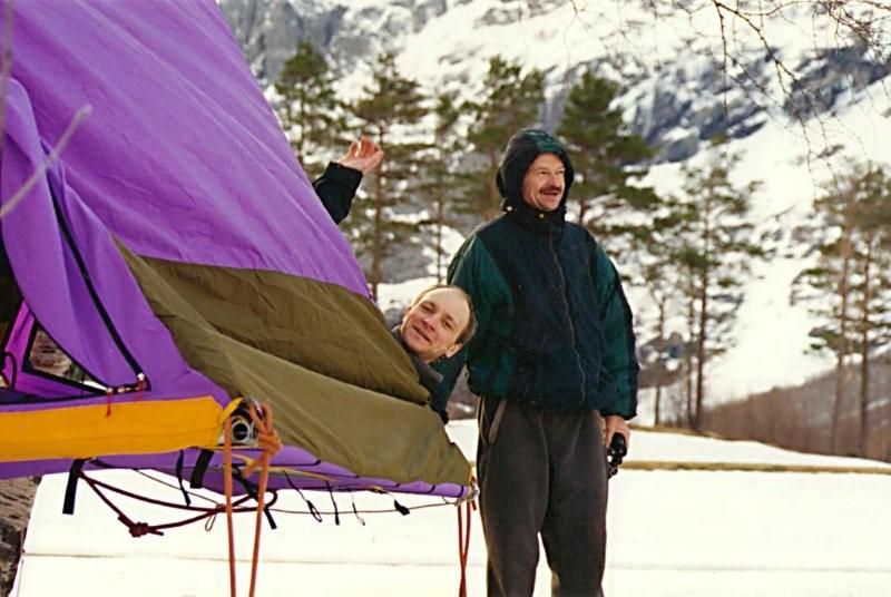 Через год зимой мы поехали в Норвегию на Стену Троллей. Выбрали самую прямую нитку по центру стены и полезли. Вова работал в паре с Женей Дмитриенко. Им всегда доставалась самая отвратительная погода - снег и ветер. Женя лезет, Вова страхует, подтаскивает веревки. А ветер такой, что Володю от скалы отрывает и свободные веревки не вниз свисают, а наоборот взвиваются вверх. И вот, пройдя очередной участок стены, Женя очень долго не мог организовать станцию страховки. Володя ждал-ждал, кричал-кричал, ответа нет - на таком ветру друг друга не услышишь. Веревку подергал - вроде закреплена. И полез на жумаре. А веревка в тот момент была пристегнута к Жениной обвязке. Он, конечно, почувствовал, что Архипов на ней повис, и крикнул вниз, чтобы тот не нагружал. Понятно дело, услышан не был. И вот, выгребает Вовка наверх, а там стоит Жека, расперевшись ногами, ухватившись за фифы, и один крючок забит в щель. Вдвоем они быстренько забили шлямбур и с тех пор понимали друг друга на горе без слов.