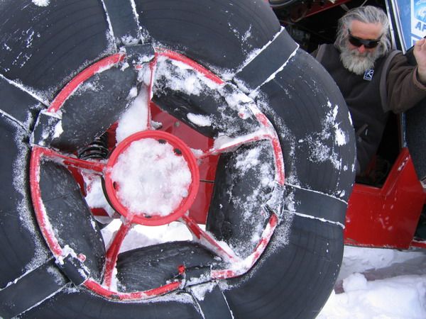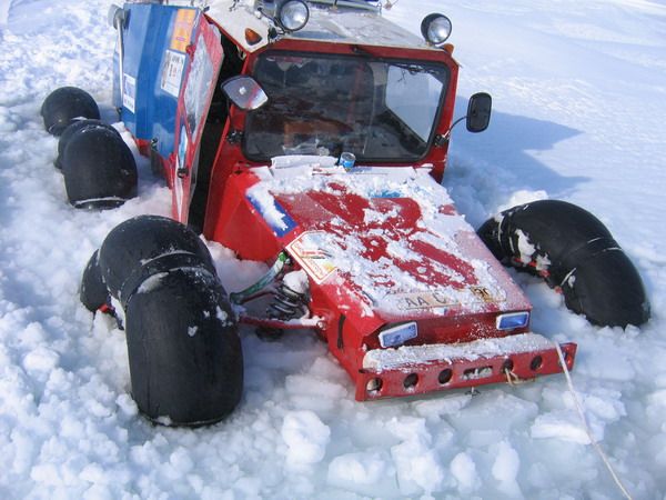 На следующий день, 25-го, начинаем движение по своим собственным следам на запад. Настроение соответствующее моменту. Снова проходим лабиринт между айсбергов и останавливаемся для фото и киносъемки в красивом месте. Параллельно делаем осмотр полуосей. Оказывается, что вовремя: на одной из них образовалась трещина, и через несколько сот метров колесо снова бы сиротливо поджалось к борту вездехода. Пришло время заняться серьезным ремонтом прямо в пути. Достаем сварочный аппарат. Штука, своего рода, уникальная: варит от штатных аккумуляторов (12/24 В), причем от 24 Вольт - 5-кой 20-ку (ток до 250 А). Помог достать сей аппарат известный радиолюбитель УКВ-ист Иван Шор (RA3WDK), за что ему очередное большое спасибо! Завариваем две полуоси и вновь начинаем движение. Становиться понятно, что осмотр состояния осей нужно делать регулярно и очень часто, дабы не пропустить момента разрастания трещины и поломки. Останавливаемся каждые полчаса. Редкая остановка не требует вытаскивания сварочного аппарата. Дима варит, остальные на подхвате. Через некоторое время процедура отрабатывается до автоматизма. Остановились, Дима и Миша - под машины. Далее, чаще всего:"Варим!", через минут аппарат около колеса, стена из "пенки" для защиты от ветра. Молоток, электроды, маска, зажим - наготове. Пищит электрическая дуга, давая надежду, что в результате все будет как надо. Дима вылезает из-под машины, стряхивает снег с комбеза, прыгает за руль и вездеходы мчат дальше. К вечеру мы уже оставили позади место предыдущей ночевки.