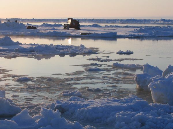 Дима заваривает очередные три полуоси, и наши автопоезда выходят на финишную прямую. Здесь главное - не торопиться на последних километрах. Как и раньше, отсюда вездеходы могут выйти только своим ходом и никак иначе. Дорога снова портиться, петляем между невысоких льдин и вечером встаем в 7-ми километрах от острова - в пределах видимости фонарей погранзаставы и ВПП.