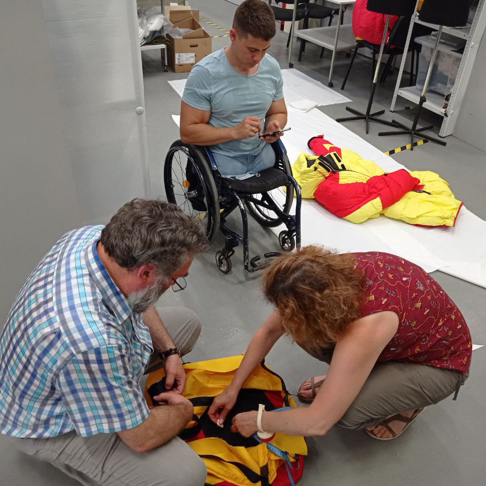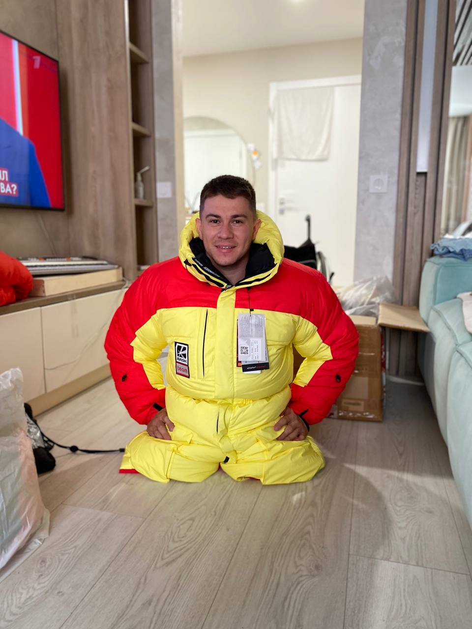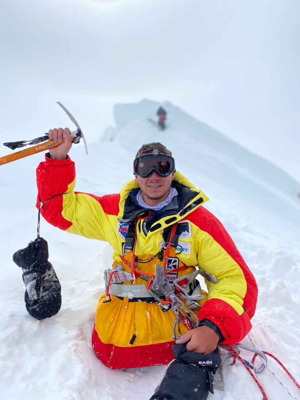 Одежда в альпинизме это – не только про удобство, но и про безопасность! Большой риск переохлаждения/обморожения мог быть у Рустама, – он постоянно соприкасался с холодной поверхностью. Для него наши друзья – компания BASK, – разработали не только индивидуальные пуховые комплекты одежды, но и специальный «кокон», который защищал от промокания основных слоев одежды.
