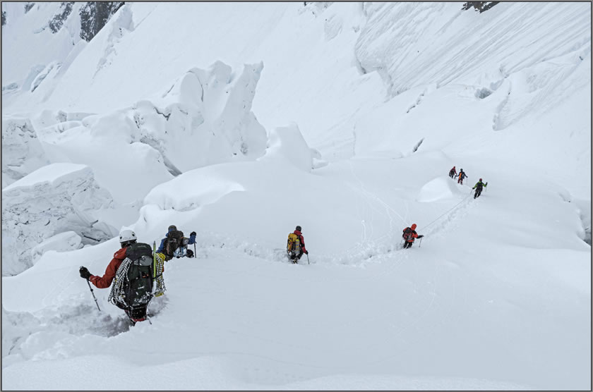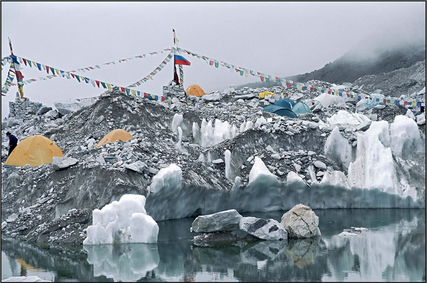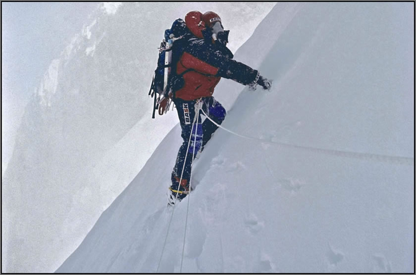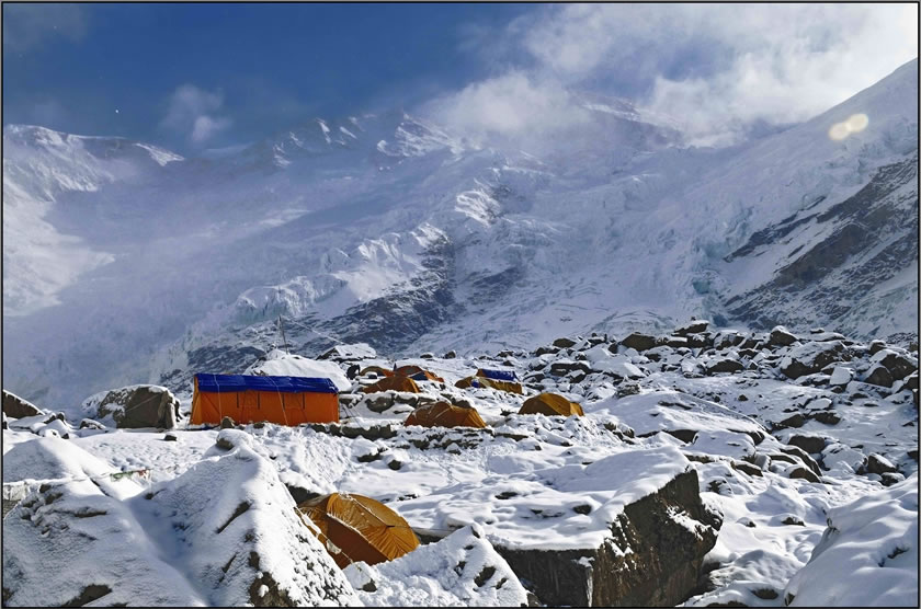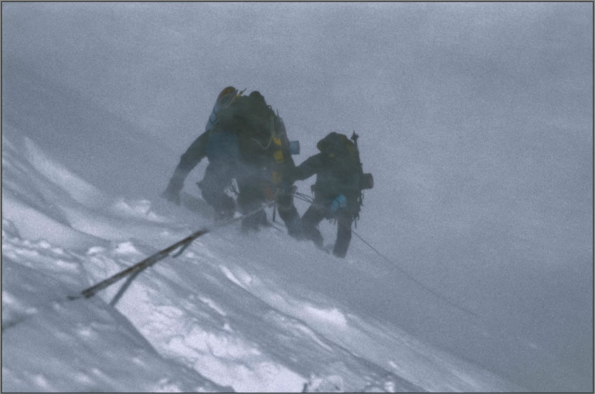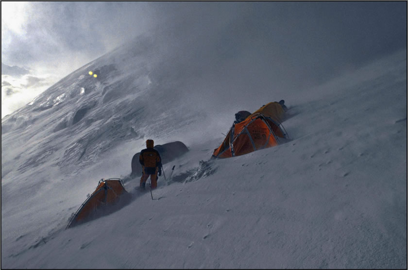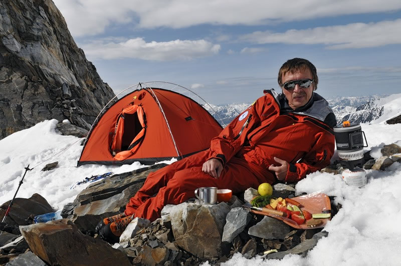 На Победе были такие моменты: стена ледовая, но не вертикальная, в один из дней мы пять часов били ночёвку под палатку. Вырубили площадку под один коврик. Конёк палатки мы притянули к снегу — она же не жёсткая. И все лавины перелетали через нас. Мы легли на коврик навстречу друг другу, а на страховку повесили все свои вещи, на всякий случай. Если пройдёт сильная лавина, то палатку порвёт, а у нас все на этой оттяжке — обувь, рюкзаки — в тубусе и пристрахованы.