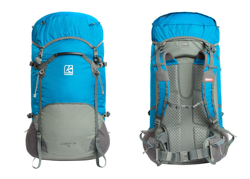 Рюкзак. Я бы выбрал БАСК Light, объёмом 65 или 75 литров, в зависимости от потребностей. У меня 65-й. Он лёгкий, хорошо сидит на спине, конструктивно продуман. Но ткань рюкзака не защищает от влаги. На простом восхождении это не помеха, можно надеть защитный чехол. На стене такой фокус не пройдёт: на рюкзаке много всего навешано.
