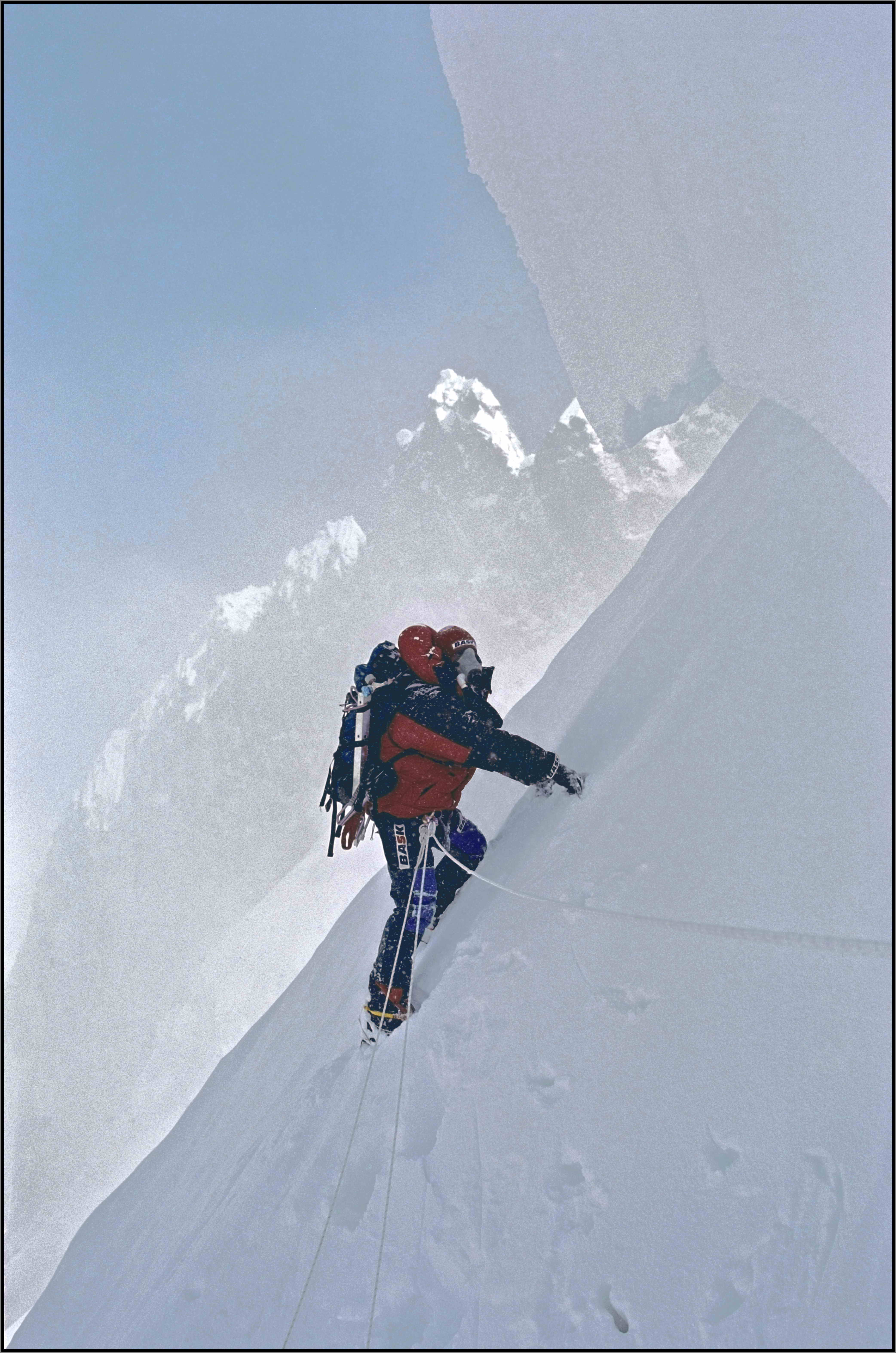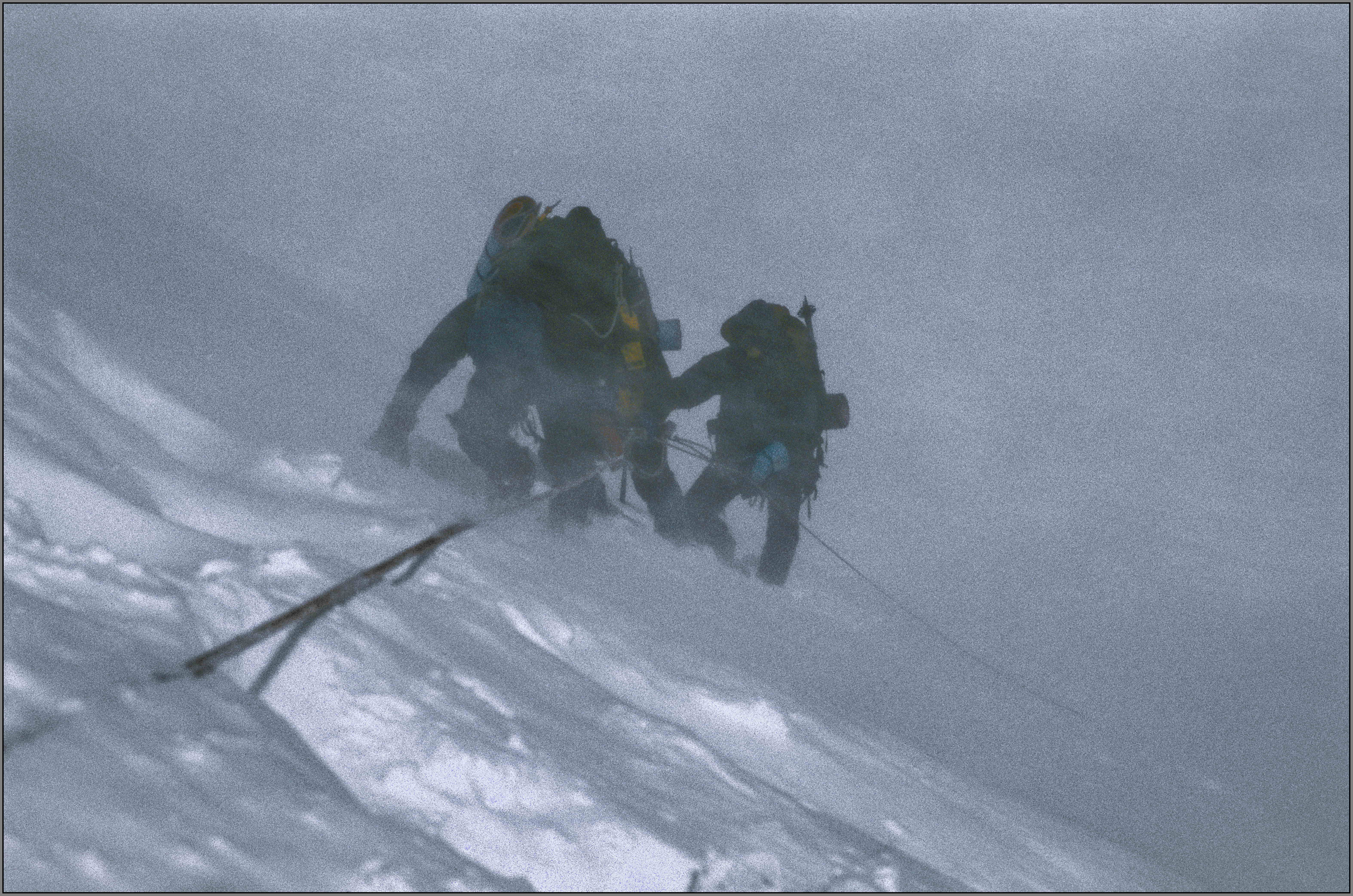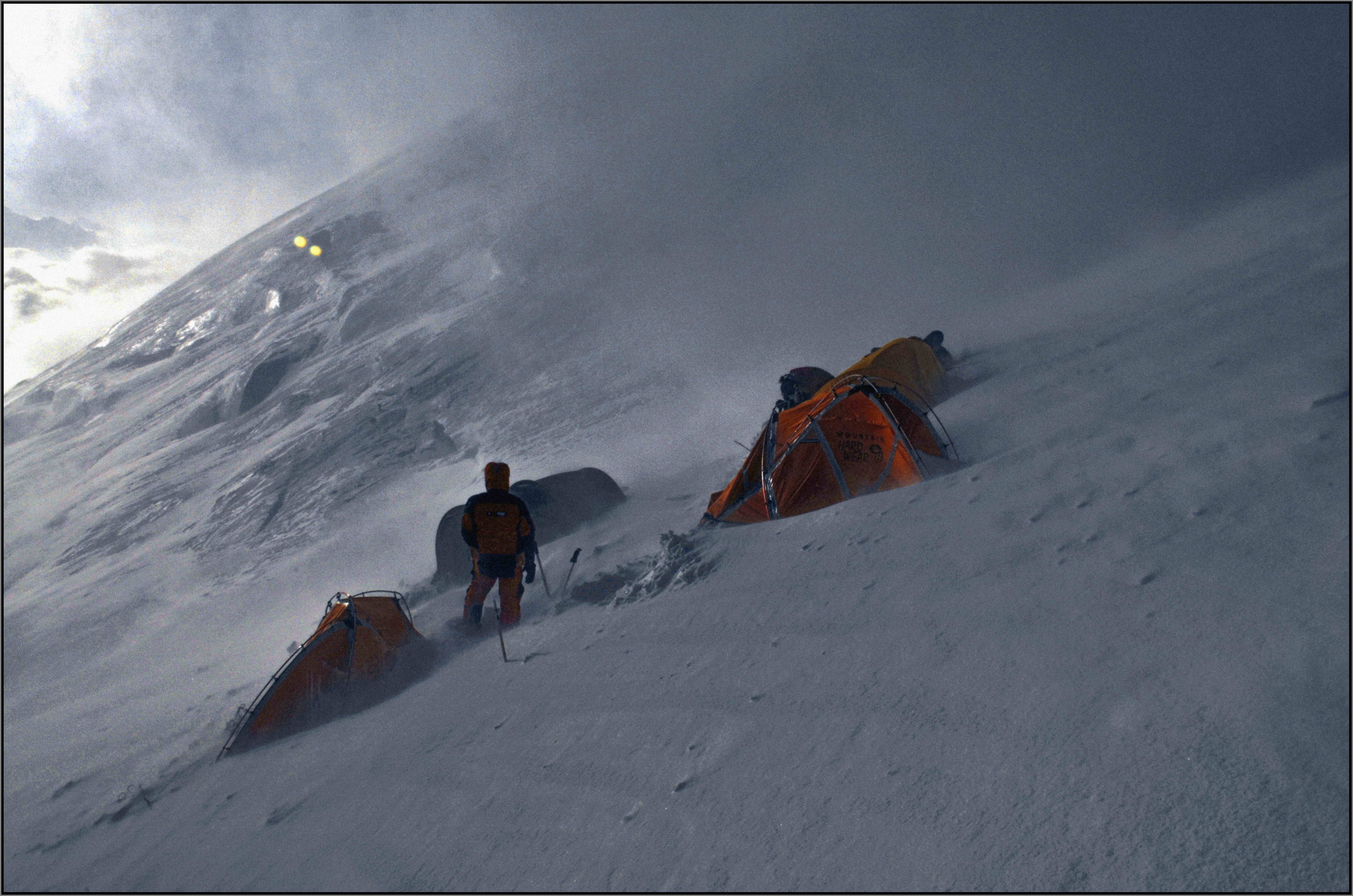 На Победе были такие моменты: стена ледовая, но не вертикальная, в один из дней мы пять часов били ночёвку под палатку. Вырубили площадку под один коврик. Конёк палатки мы притянули к снегу — она же не жёсткая. И все лавины перелетали через нас. Мы легли на коврик навстречу друг другу, а на страховку повесили все свои вещи, на всякий случай. Если пройдёт сильная лавина, то палатку порвёт, а у нас все на этой оттяжке — обувь, рюкзаки — в тубусе и пристрахованы.