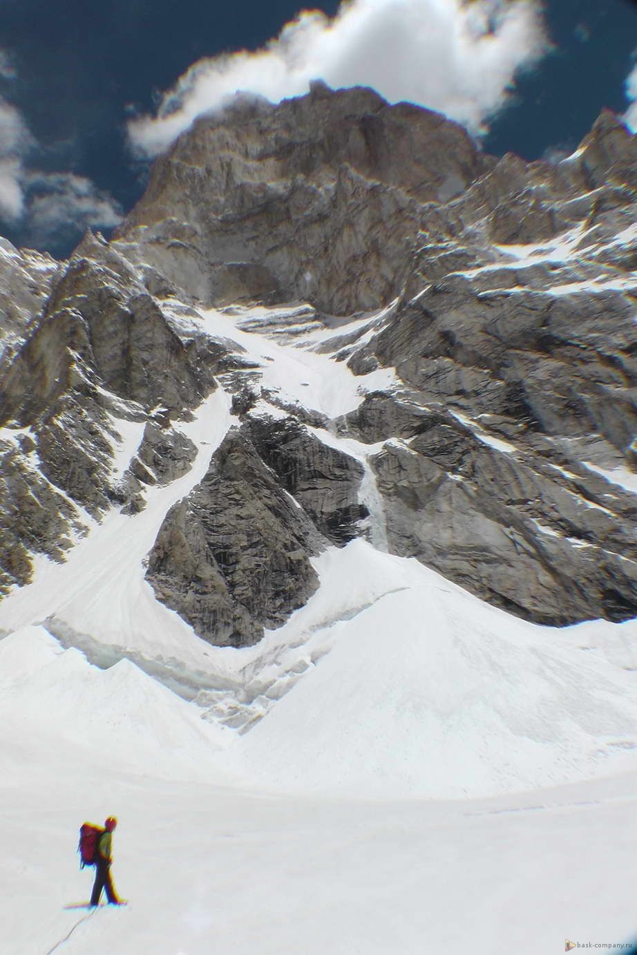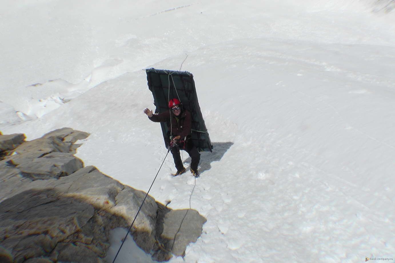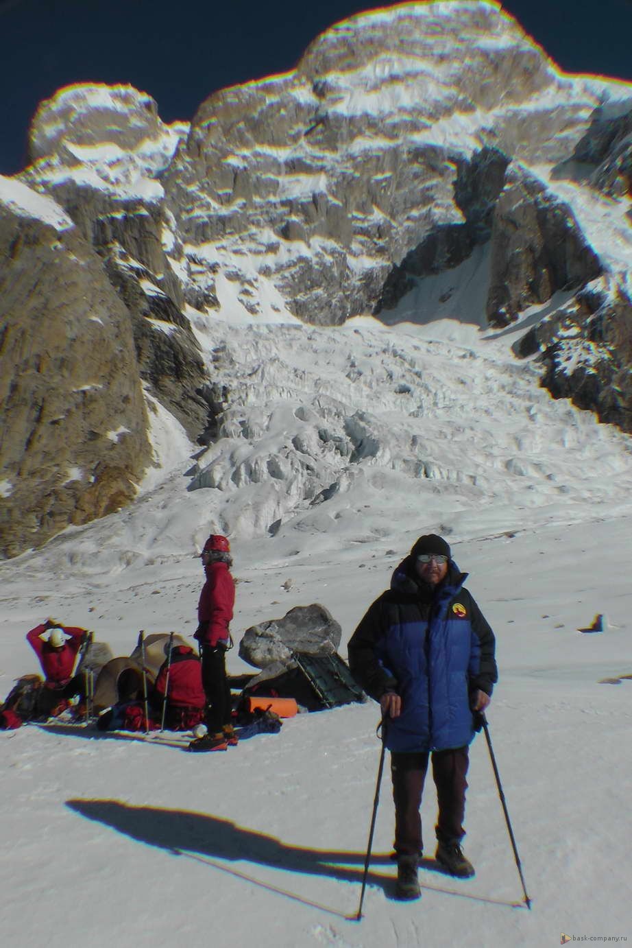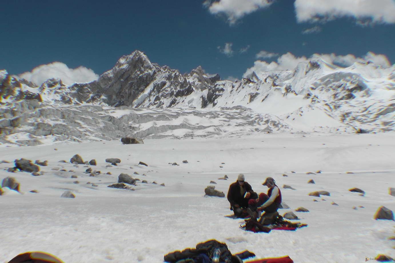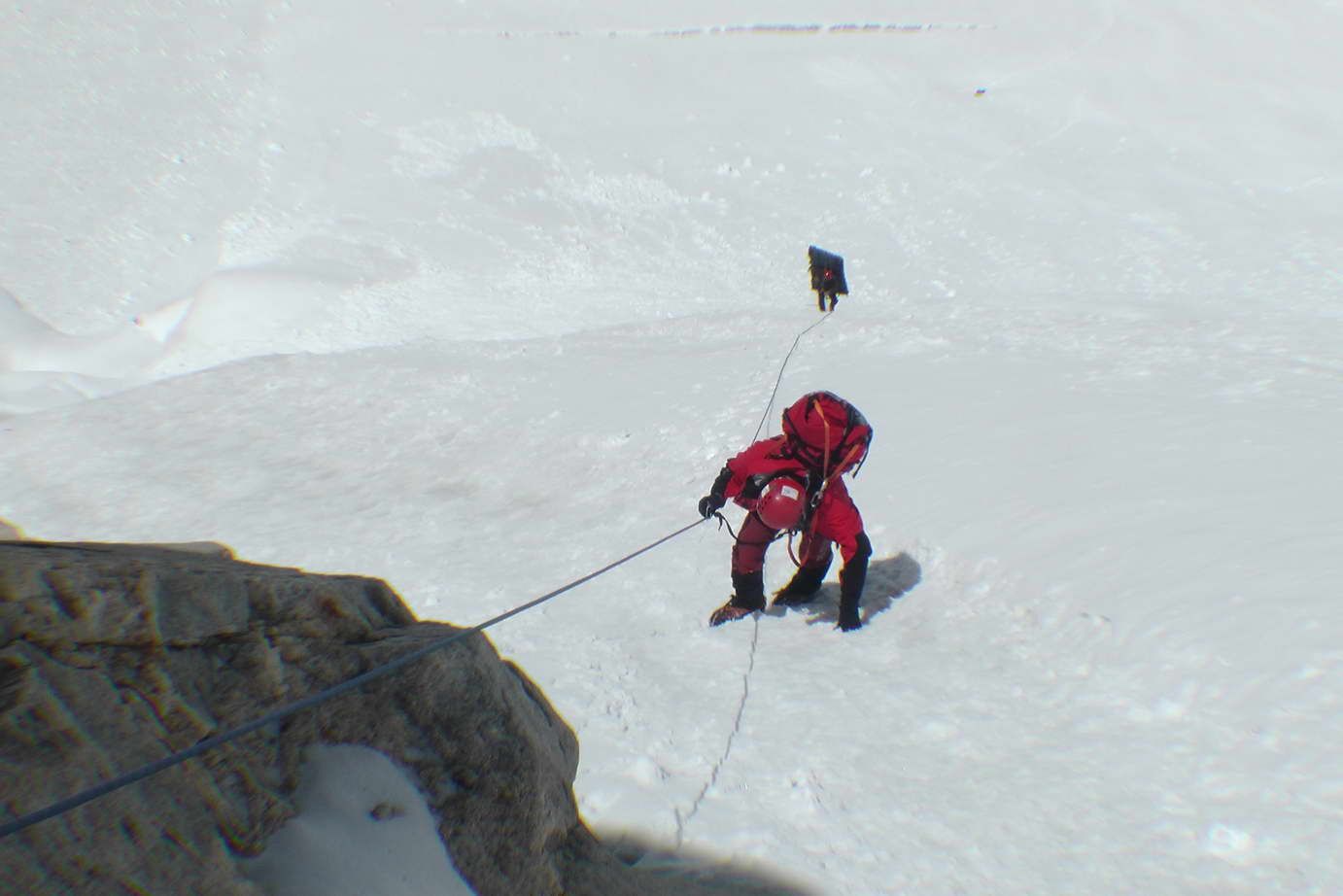 Команда 7-го июня выходила в АВС, прошла бергшрунд и закрепила на скале снаряжение и груз для восхождения.