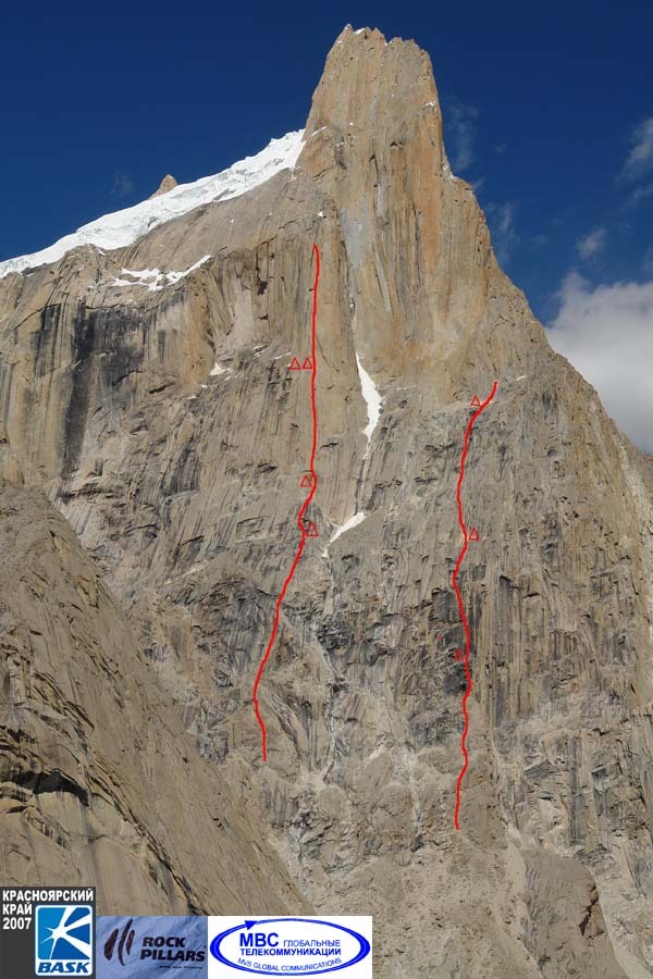 Команда Михалицина пролезла 6 веревок и заночевала на вершине первого скального бастиона.Обработали две веревки к началу отвеса второго бастиона. Второй и третий бастионы - это будет технически самая сложная часть маршрута. Мы рисуем на фотогафии примерную нитку маршрутов, могут быть незначительные неточности, т.к. наблюдение ведем из-под горы, где смотрится все по-другому, а фото сделано с большого расстояния.