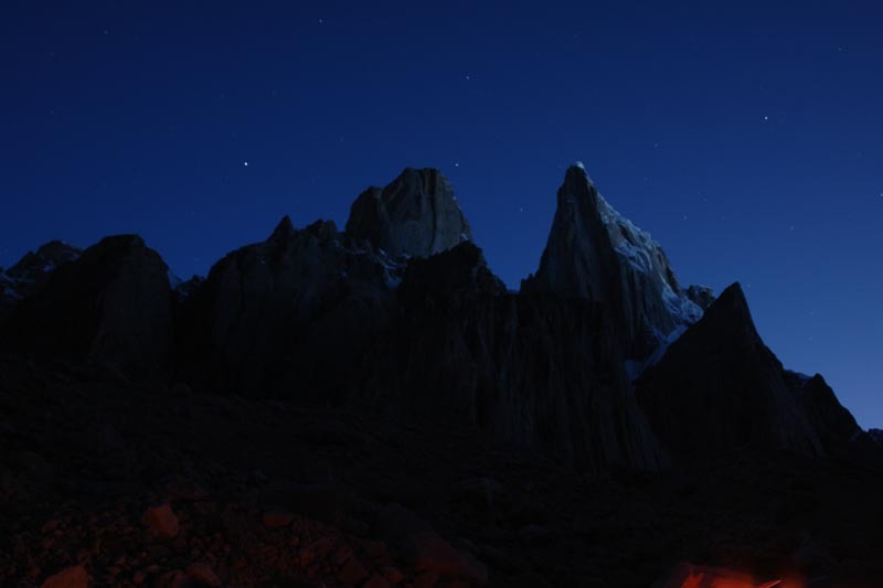 Обе команды работали сегодня до темноты, используя отличную погоду. У команды Хвостенко на сегодня пройдено 35,5 веревок (не долезли 10 метров до вершины первого скального бастиона). Заночевали в двух веревках ниже, там, где на полке нашли снег. Им еще предстоит сделать траверс гребня этого бастиона около 150 метров, затем пару веревок снега или льда к подножию предвершинного бастиона и, непосредственно, сам отвесный бастион метров четыреста.