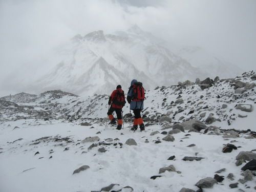Теперь оставалось самое сложное, известить команду о том, что мы шли в лес, а пойдём по дрова. Догнав команду и набравшись наглости задыхаясь я прокашлял : ну что, погода супер, нечего терять время, шерпы просят нас продолжать движение вверх и сами напросились притащить нам Лагерь 1.Не ударим в грязь лицом перед шерпаками, тем более что вниз идти уже опаснее чем вверх, так как тропу замело, и в одиночку вернуться шансов 50 х 50.