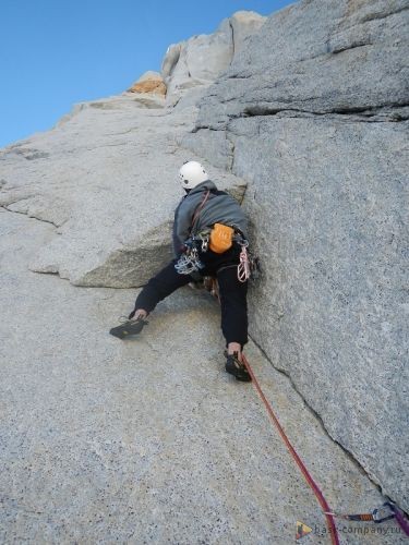 После короткого совещания, мне выпадает начинать лезть первым. Такого кайфа, я давненько не испытывал. Вначале встречались разрушенные места с плохой страховкой, но в целом первые четыре питча – это великолепное лазание по различным щелям. Иногда трещина заканчивалась. Тогда искали переход в соседнюю. Переходил лазанием по slab-ам (наклонная плита с минимальным количеством рельефа). Мы реально получали удовольствие от каждого питча. На станциях поздравляли друг друга с отличным лазанием.