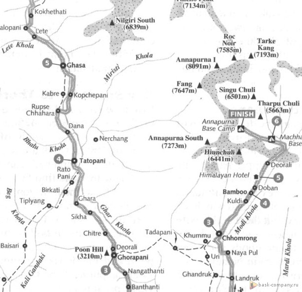 Справка: Аннапурна Гимал - это самая интересная группа гор всего Непала. Основные вершины западной части великого Аннапурна Гимал, включая Хинчули (6441 м) - это Южная Аннапурна (7279 м), Варах Шикар (Varah Shikar) (также называемой Клык ( The Fang ) 7647 м ), Аннапурна (8091 м), Дхаулагири I (8167 м) Аннапурна III (7855 м) и Маччапучаре (6993 м). Вершины расположены по кругу, диаметром 10 миль, в центре которого покрытый льдом амфитеатр. Это место называют святилище Аннапурны.