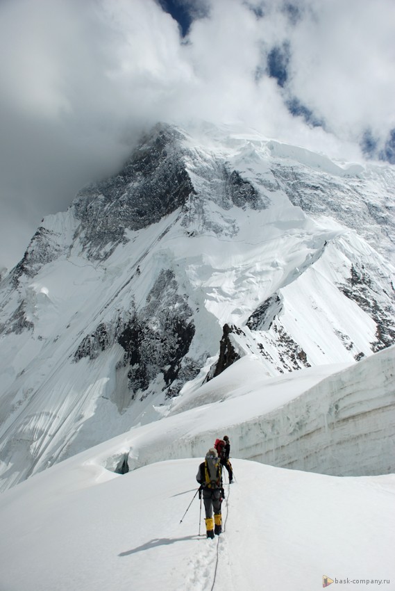 Маршрут: Крутой (60–65град) снежно - ледовый склон, далее гребень – нож, приблизительно с 6500м. бастион - крутые обледенелые, заснеженные скалы с вертикальными и нависающими участками, с рыхлым снегом на скалах.
