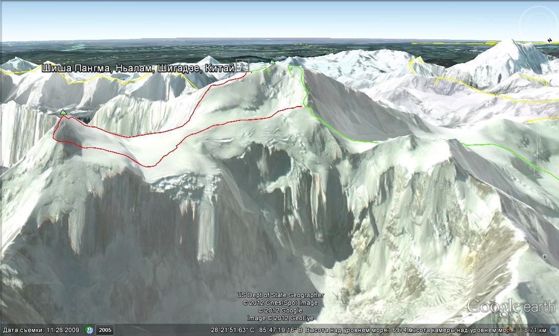 Летом - ничего серьёзного. Возможно - Актру. Для поддержки акклиматизации в июле-августе восхождение на пик Ленина. В сентябре-ноябре экспедиция - на Шиша-Пангму. С Александром, а может, и ещё с кем, хотим сходить новый маршрут на две вершины через пик Моламенкинг (7661м) (фото 2).Остальные участники поднимутся по классическому пути и также попытаются взойти на две вершины (8008м и 8027м).