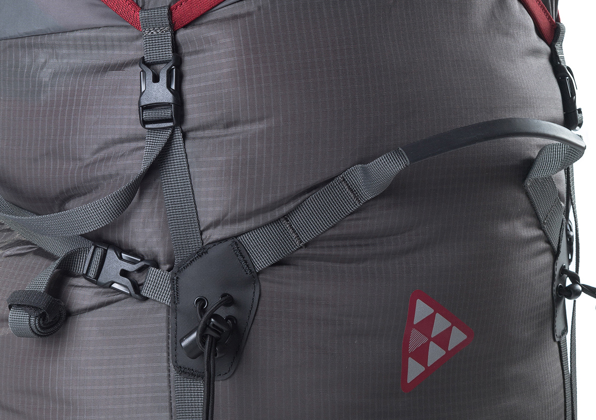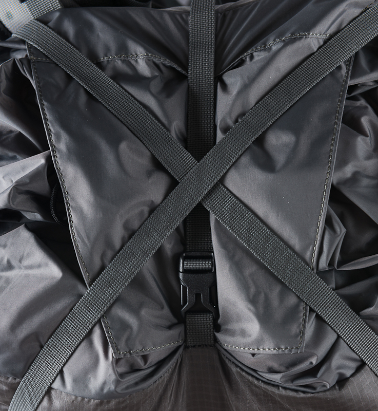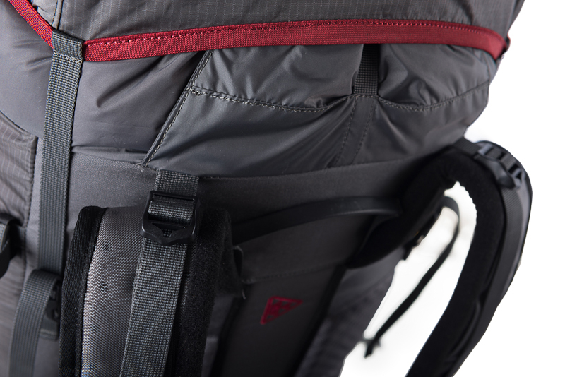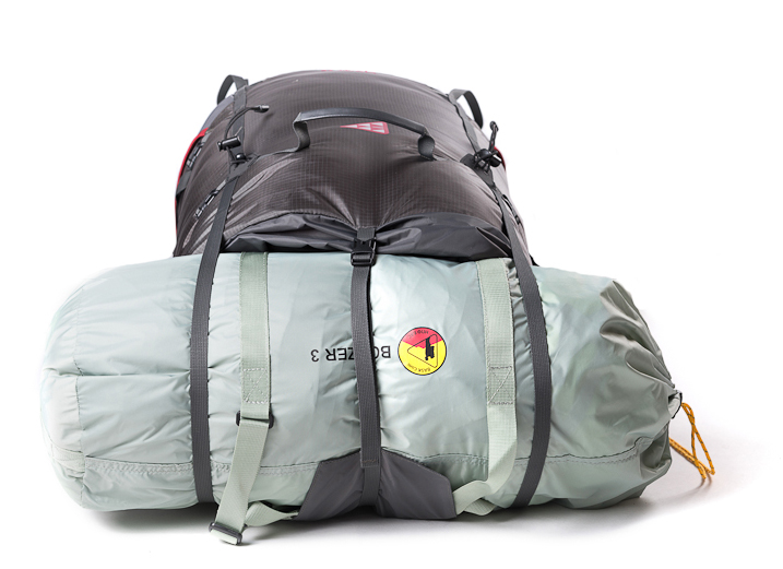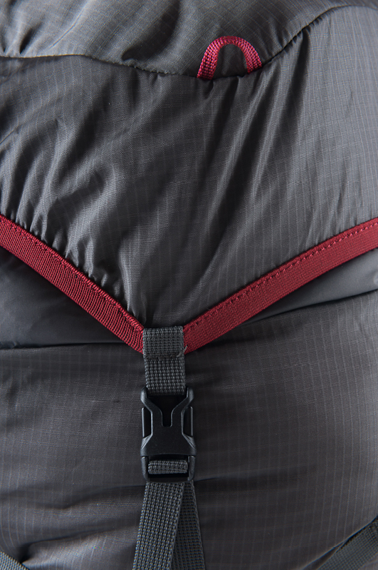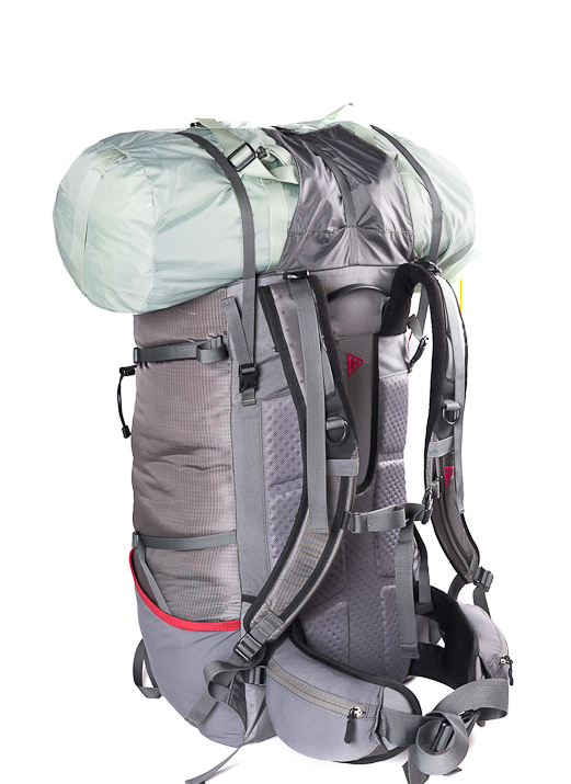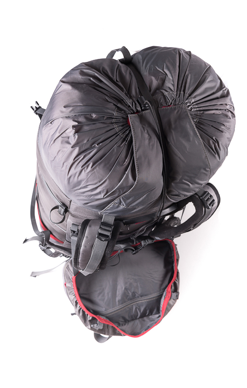 Нарушены пропорции? Не беда: можно пристегнуть спальник или палатку к верхней части рюкзака. Для этого случая предусмотрено две длинные стропы (при снятом клапане они продолжают замыкать силовой каркас в продольном направлении), которые прекрасно удержат вещи сверху (крест-накрест или параллельно). Зачем нужен клапан в такой компоновке? Чехол от палатки или компрессионный мешок спального мешка обычно изготавливаются из влагостойкой ткани. Можно оставить клапан дома и снизить вес на 150 г.
