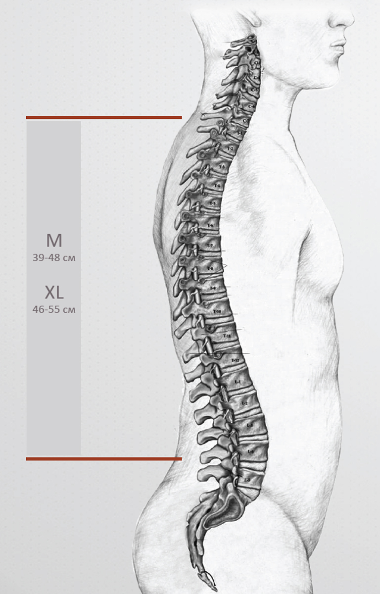 - попросите измерить свою спину от 7 позвонка (С7 – это самый заметный позвонок на шее – находится примерно в проекции плеч на позвоночник) до проекции верха тазобедренной кости на позвоночник
