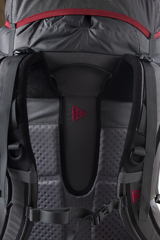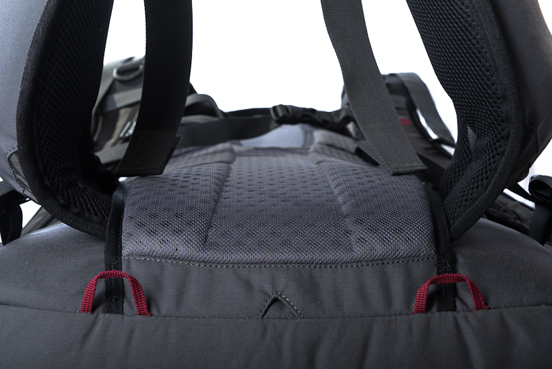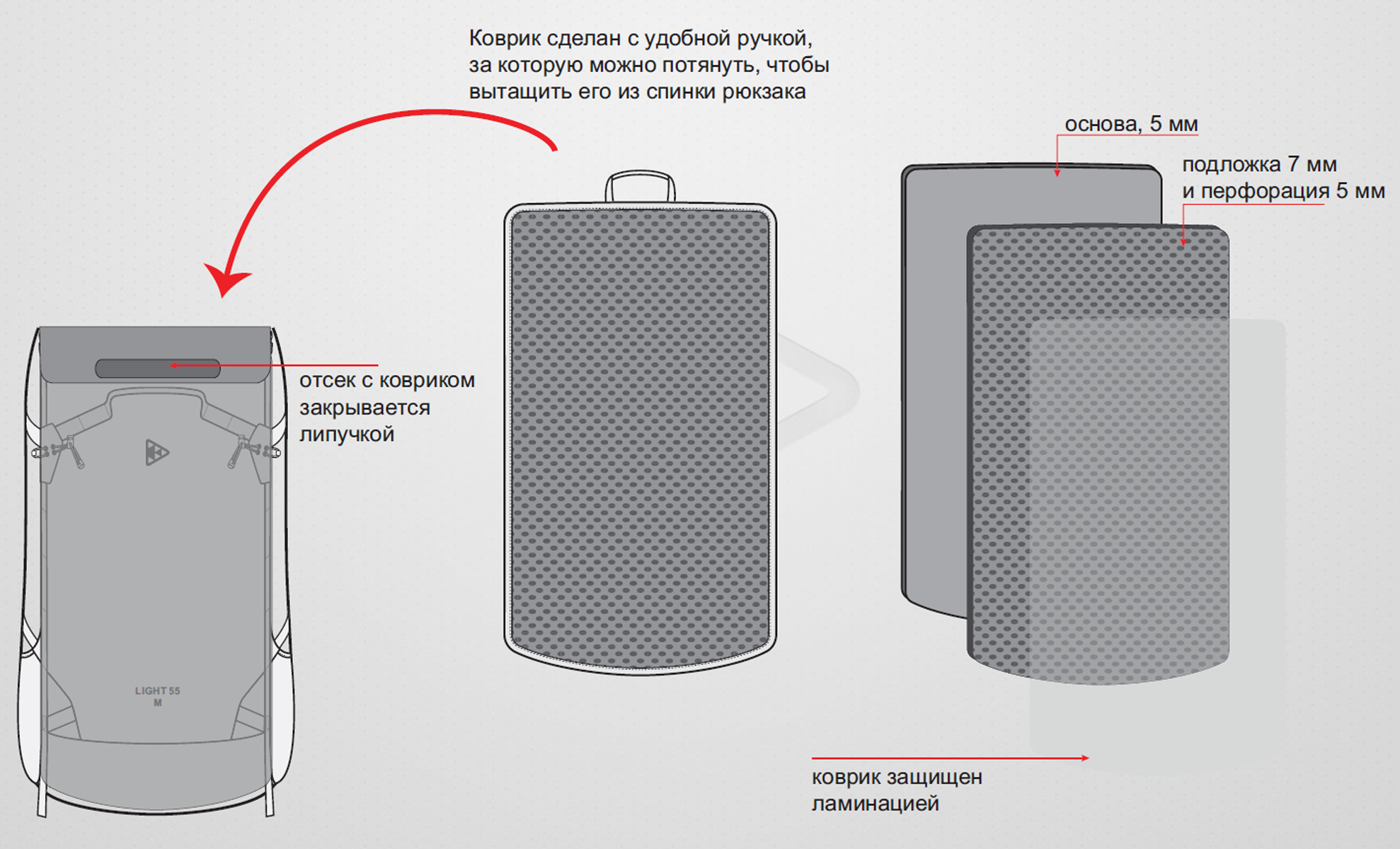 Спина рюкзака термоформирована специальным образом так, что при использовании обеспечивается хорошая вентиляция. Перфорация в «пенке» спинки, коврика и лямок выполнена не насквозь, а на 2/3 толщины. С одной стороны уменьшен вес, с другой – не нарушены тепловые свойства пенополиуретана.