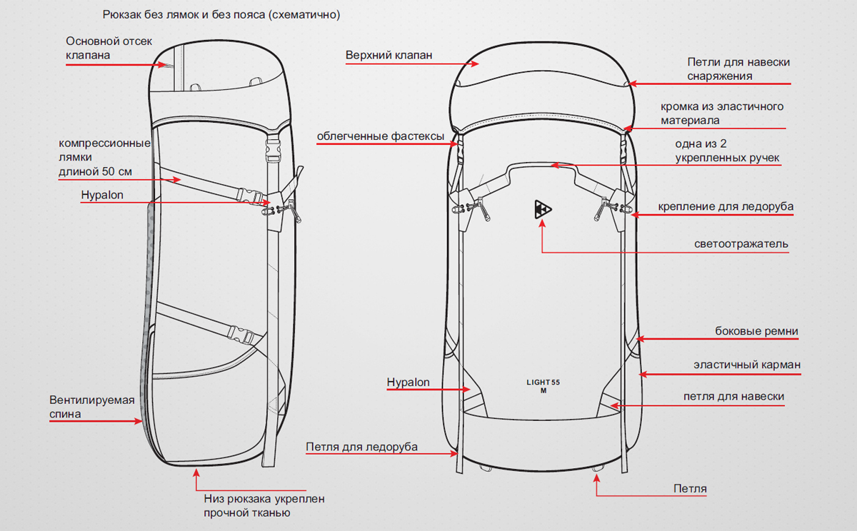 Вес мешка с лямками Light 55-M – 650 гр, при этом он имеет полноценные лямки и полноценную спину. В таком виде можно нести до 15 кг. Если вес груза больше мы рекомендуем использовать пояс. Вес рюкзака станет равным 860 г. В такой комплектации можно нести груз до 25 кг. Если же вставить коврик (вес рюкзака в такой комплектации станет 950 г.), то можно нести груз до 35 кг. Напомним, что прототип новой серии Light - рюкзак Light 69 мы рекомендовали использовать для ношения грузов до 25 кг. Новая серия существенно комфортнее и надежнее.