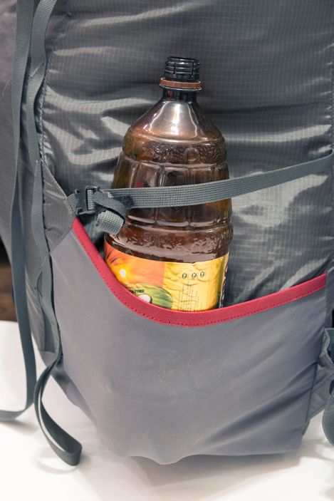 Боковые карманы из прочной ткани хорошо тянутся. В них можно положить даже 2-х литровую бутыль и закрепить её дополнительно боковой стропой, чтобы она не вываливалась. При отсутствии вещей в кармане он не топорщится и плотно примыкает к рюкзаку.