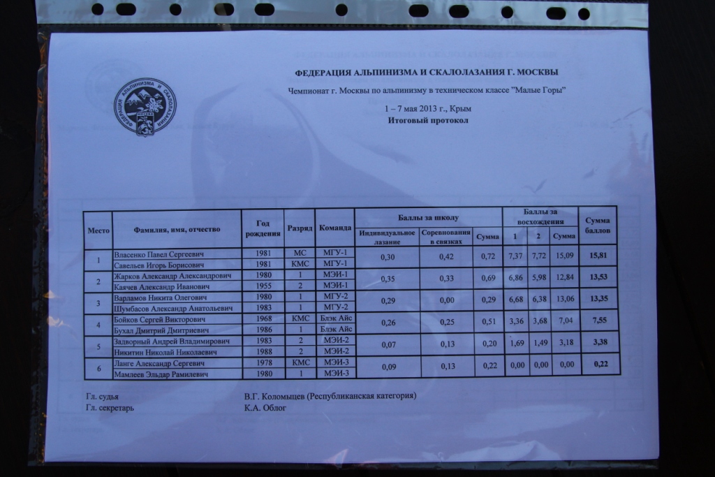 Связка Каячев – Жарков 1-й маршрут «Мачомбо» на Морчеке прошли за 10 часов, а в последний день заявили «Центр» на Форосском канте не с самым высоким рейтингом. Их соперники Варламов Никита и Шумбасов Александр прошли маршрут «Мачомбо» за 11 часов и маршрут «Гиперборея» на Шаан-Кае за 13,45 часа. После этапа «Школа» у энергетов был запас 0,4 балла и учитывая, что скорость прохождения маршрута по действующей в этом году формуле имела весомое значение, им нужно было завершить восхождение до 17.00. (контрольное время в 3-й день восхождений – 18.00). С этой задачей два Александра успешно справились, и несмотря на то, что за восхождения они получили 3 место, в итоге они завоевали серебро. Варламов Никита и Шумбасов Александр завоевали бронзу.