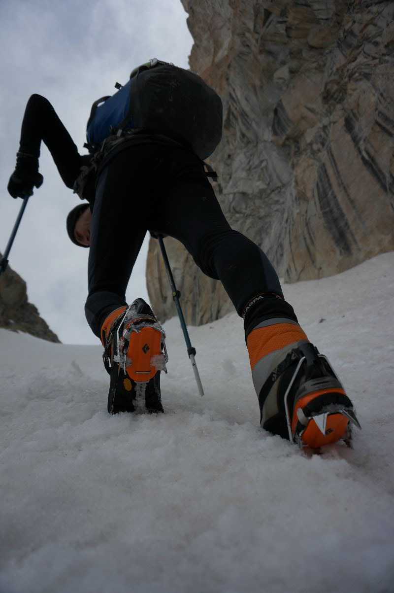 Выход рано утром по холодку. Большой кулуар, ведущий под Транго Неймлесс проходим на крейсерской скорости.