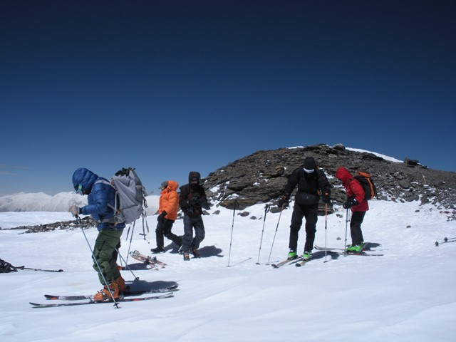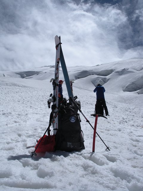 Очень актуально при спуске на достаточно крутом каменистом склоне. Например ,при спуске с Текеторской морены,либо с Рацека. При просто пристегнутых лыжах гарантировано несколько раз долбанешь лыжой о валун. А это ж лыжнику как серпом по скользяку..ну, вы поняли. Да и рюкзак при такой переноске снимать и ставить проще . Когда лыжи снизу торчат- прислонять надо или класть плашмя,что не всегда гут. Вешки тоже удобно таскать,не вываливаются ,достаешь одной рукой на ходу.
