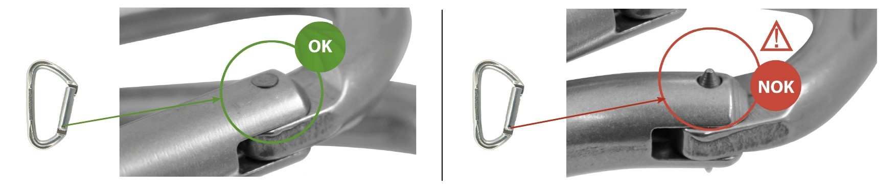 Так можно проверить, соответствует ли Ваш карабин требованиям безопасности: необжатая клепка имеет заостренный конец, и существует риск ее выхода из паза.