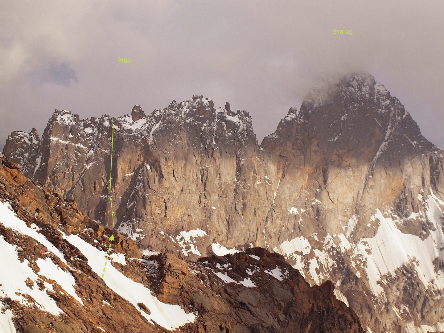 Тогда я стал давать условные названия вершинам Ашатской стены. В этом году немного поправил самого себя: двойной самый восточный пик (по схеме 4700) предложил назвать Диоскурами (Полуксом и Кастором), далее явно более низкий пик (4750), похожий на древнегреческий корабль – Арго. Следующий перед Сабахом пик, напоминающий шлем древнерусского воина, который явно выше, чем высота 4810, приписанная ему схемой, я предложил назвать Сварог, тем более, что в рельефе под карнизом проступает лик, напоминающий языческого славянского Бога.