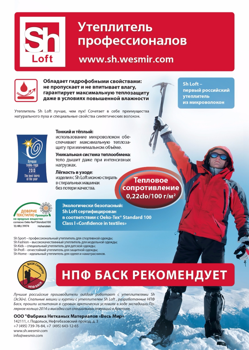 Также тестирование проводилось Яриным Михаилом, эспертом по экипировке, в ходе восхождения на Казбек. Помимо отличных теплоизолирующих свойств, он особо отметил, что куртка и спальный мешок с утеплителем Shelter Loft® выгодно отличаются по весу и толщине от импортных аналогов, особенно, с пухом.