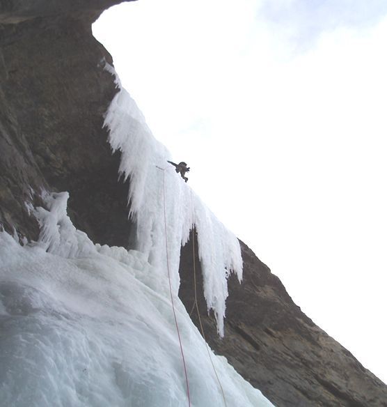 Перепад маршрута по высоте составляет 1500 метров; нижняя её часть, замерзший водопад "Le Lotus Bleu" 150m V, WI 5, был уже пройден ранее. Но как правило, на этом все и ограничивались. Выше зимой по этой стене уже никто не поднимался.