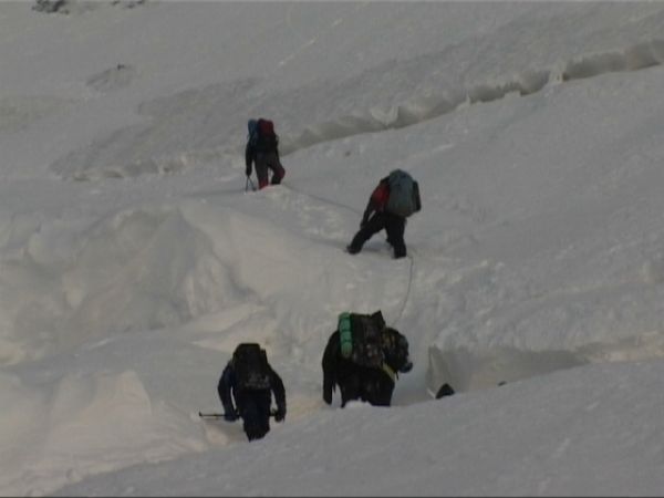 продвигается довольно медленно. первые несколько веревок снега дались непросто, под каждую точку страховки приходилось рыть большие ямы, несмотря на это cтраховка очень ненадежная.