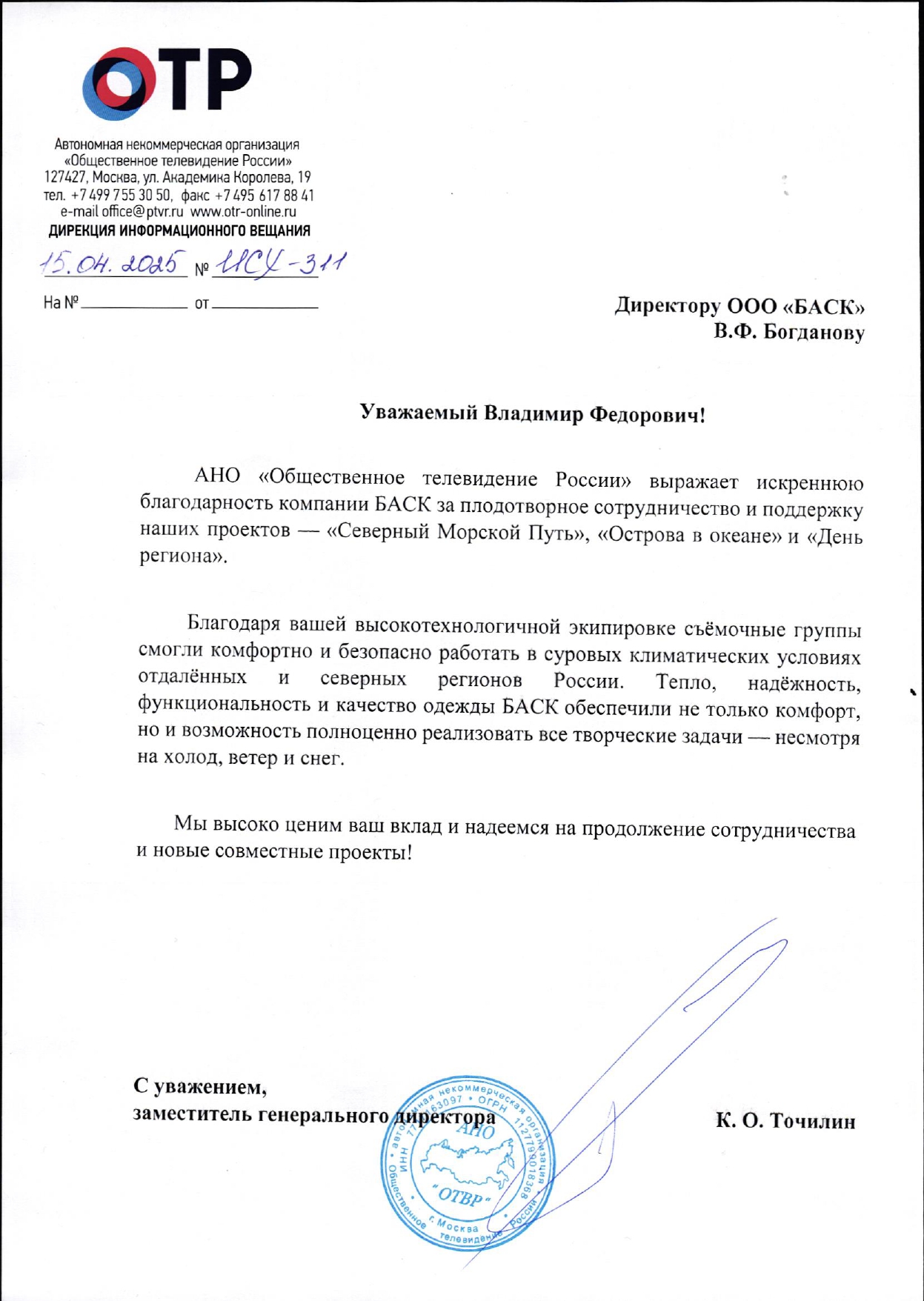 «Благодаря вашей высокотехнологичной экипировке съёмочные группы смогли комфортно и безопасно работать в суровых климатических условиях отдалённых и северных регионов России. Тепло, надёжность, функциональность и качество одежды БАСК обеспечили не только комфорт, но и возможность полноценно реализовать все творческие задачи – несмотря на холод, ветер и снег», – говорится в благодарственном письме за подписью заместителя генерального директора АНО «Общественное телевидение России» Константина Олеговича Точилина.