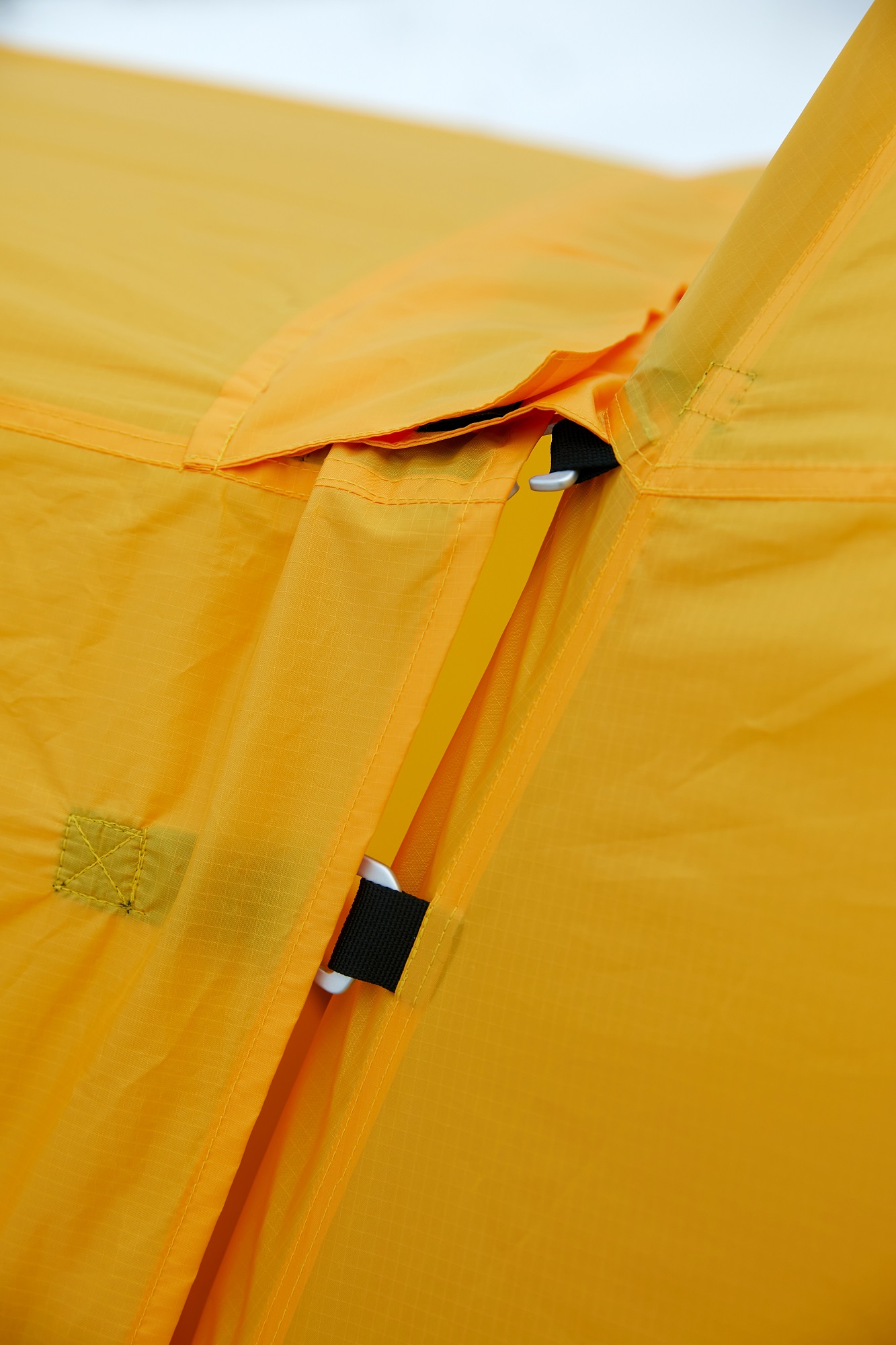 BASK HIGH PEAK V2 имеет правильную шестиугольную форму – оптимальную для скатывания снега и ветроустойчивую по всем граням (для переменчивой высотной «розы ветров» это – особенно важно). Надежность конструкции обеспечивается шестью 9,5-миллиметровыми дугами из алюминиевого сплава повышенной вязкости со специальным покрытием, препятствующим развитию коррозии. Палатка-коннектор имеет форму геодезического купола с четырьмя дугами. Силовые дуги всех трех палаток соединяются в продольной плоскости путем помещения их наконечников в люверсы. Каждая конструкция имеет оттяжки, которые крепятся на поверхности колышками.