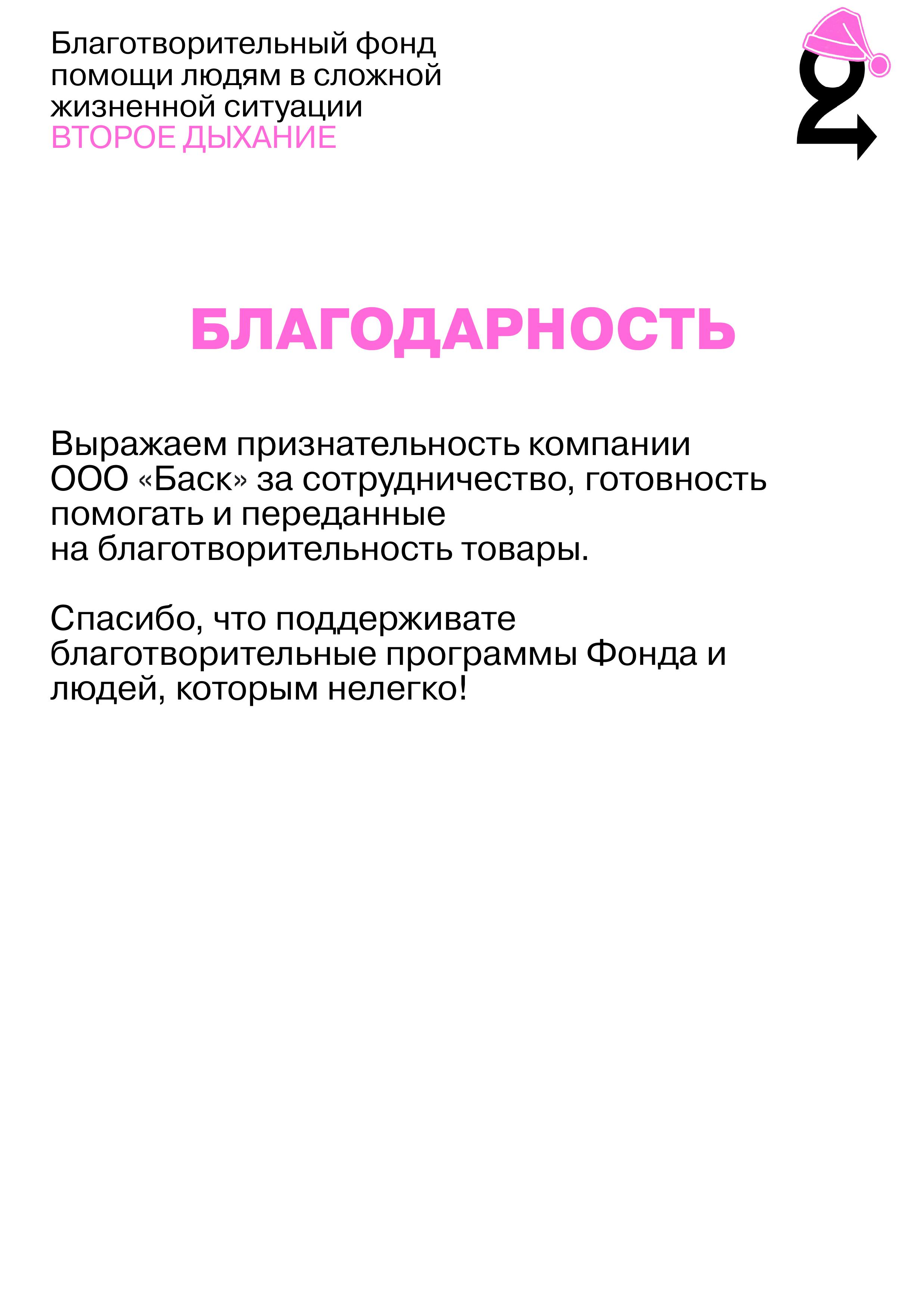 «Выражаем признательность компании ООО «БАСК» за сотрудничество, готовность помогать и переданные на благотворительность товары. Спасибо, что поддерживаете благотворительные программы Фонда и людей, которым нелегко», – говорится в письме, направленном Фондом в адрес нашей компании.