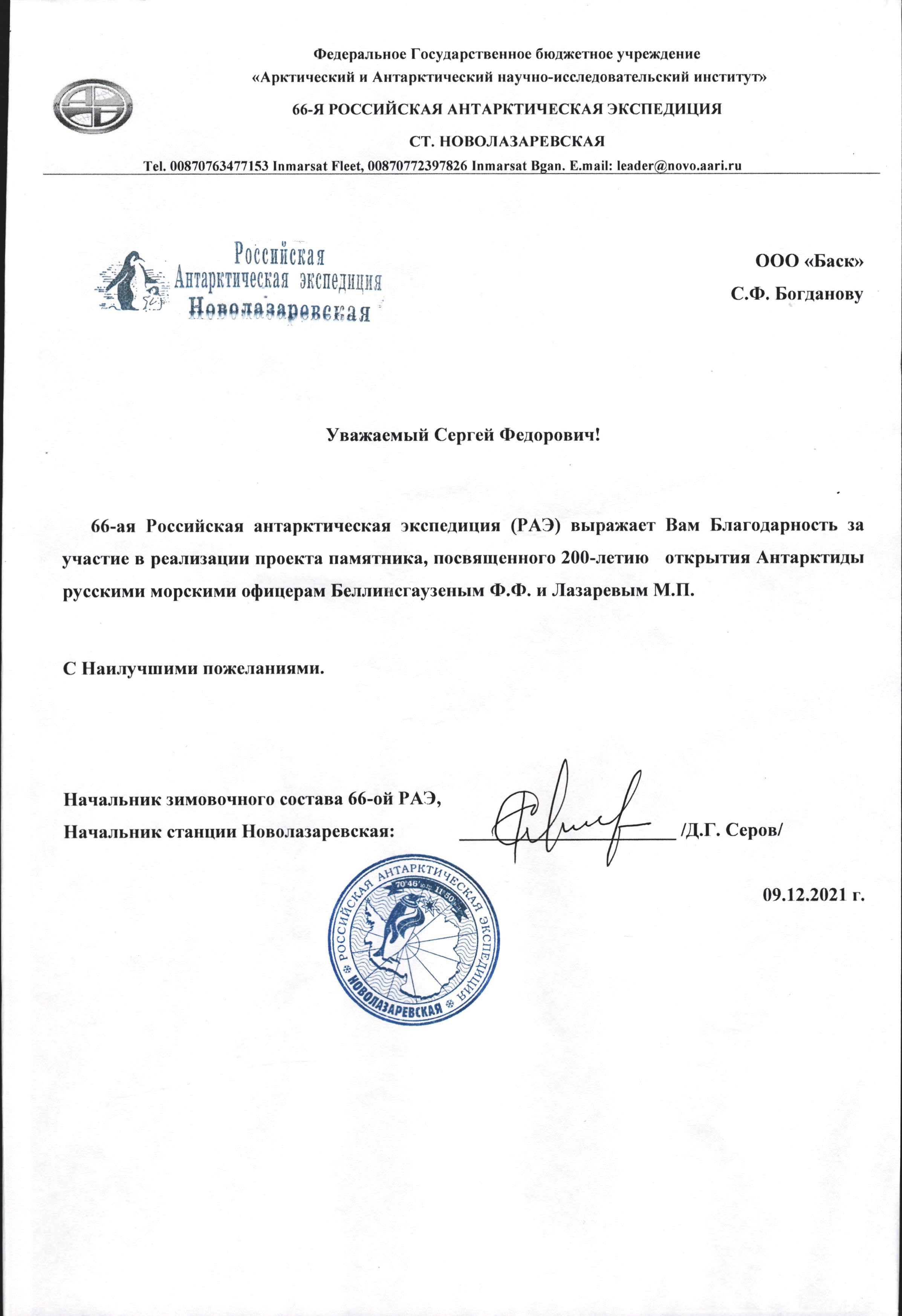 «66-я Российская антарктическая экспедиция (РАЭ) выражает Вам Благодарность за участие в реализации проекта памятника, посвященного 200-летию открытия Антарктиды русскими морскими офицерам Беллиrtсгаузешым Ф.Ф и Лазаревым М.П.», – написал в благодарственном письме Начальник зимовочного состава 66-ой РАЭ, начальник станции Новолазаревская Д.Г.Серов.