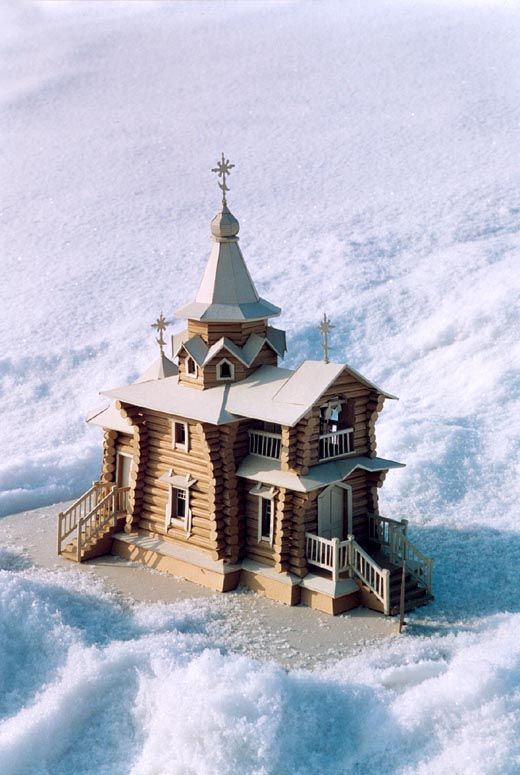 Несколько слов о церкви. Воздвигнута она на станции Беллинсгаузен пару лет назад: срублена алтайскими мастерами и перевезена на судне в Антарктиду. Церковь стоит на высоком утесе и является настоящим украшением этих унылых мест. Она стала очень популярной и не только среди россиян и у православных. Храм посещают все почетные гости, прибывающие на соседнюю чилийскую станцию, приходят иностранцы, работающие на «Беллинсгаузене». Снами утреннюю литургию отстояли четверо англичан. Сейчас службу в храме справляет иеромонах Калистрат, который зимует вместе с полярниками и принимает активное участие в повседневной жизни станции.