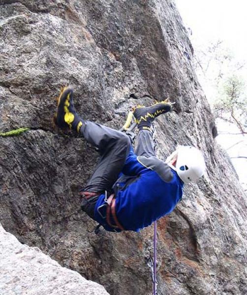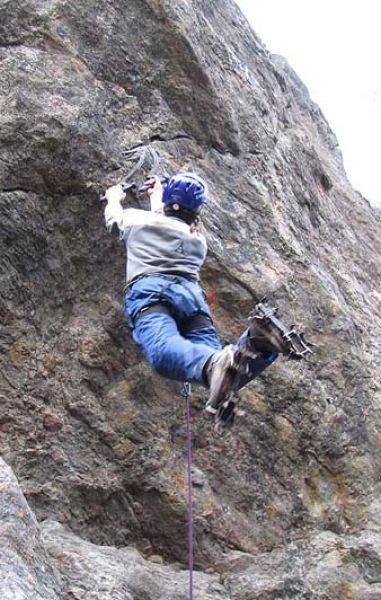 8 мая после обеда на скалах около судейского городка состоялись квалификационные старты для всех желающих. Некоторые участники готовились заранее и приехали со своим снаряжением – подкошечными ботинками и кошкоботами, кто-то проходил мимо, заинтересовался происходящим и решил попробовать. В этом случае кошки одевались прямо на кроссовки. Надо отдать должное кошкам SIMOND, которые даже в этом случае надежно держались и не слетали. Был только один случай потери кошки, и то вместе с ботинком.