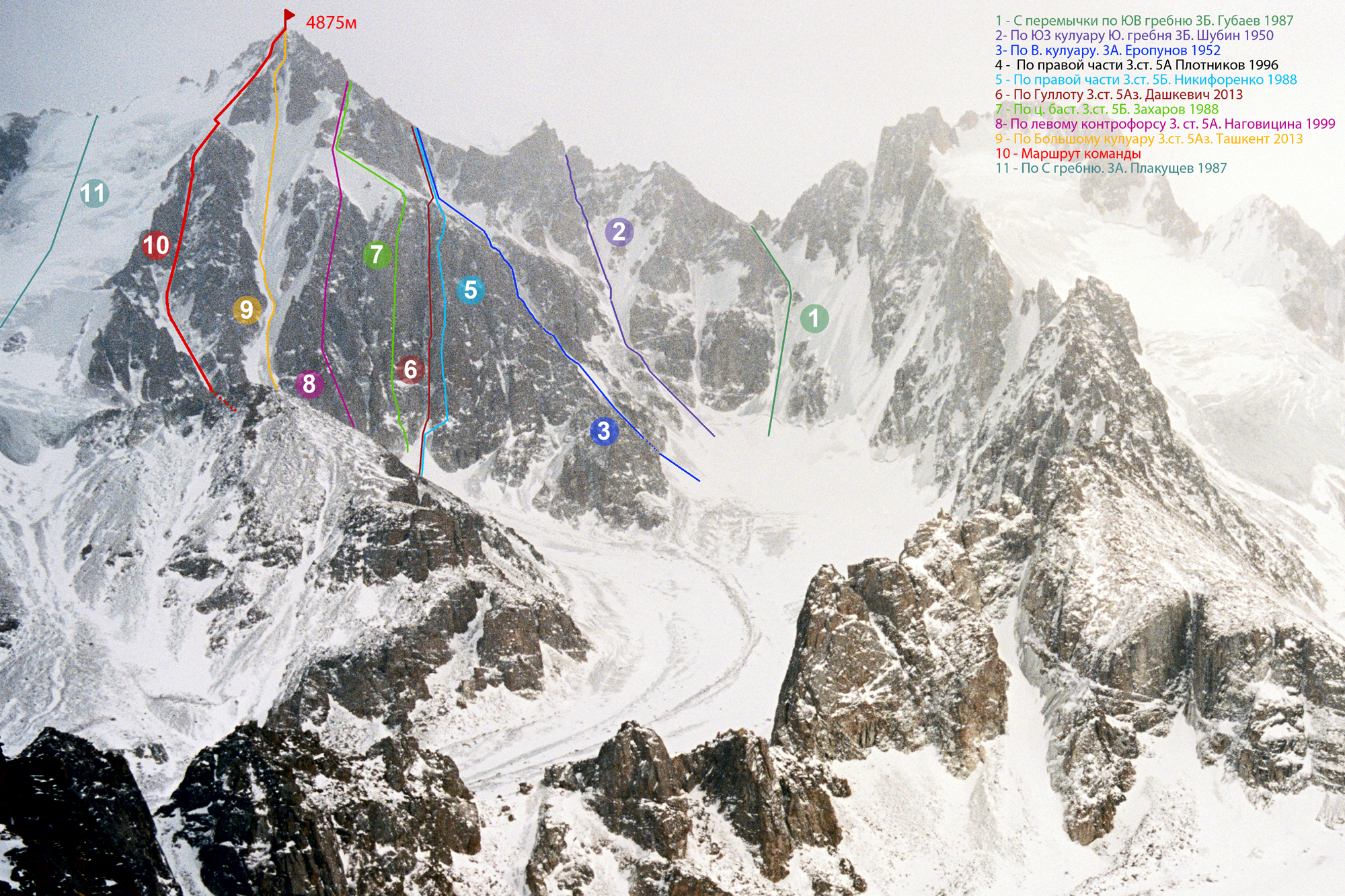 22 февраля - Пробовали пройти новый маршрут по кулуару между 5 и 6 Башнями Короны. Но непогода и постоянные пылевые лавины вынудили спуститься вниз по пути подъема не дойдя около 2-х веревок до гребня. Прохождение маршрута решили отложить на другой раз...23 февраля- Спустились в Бишкек