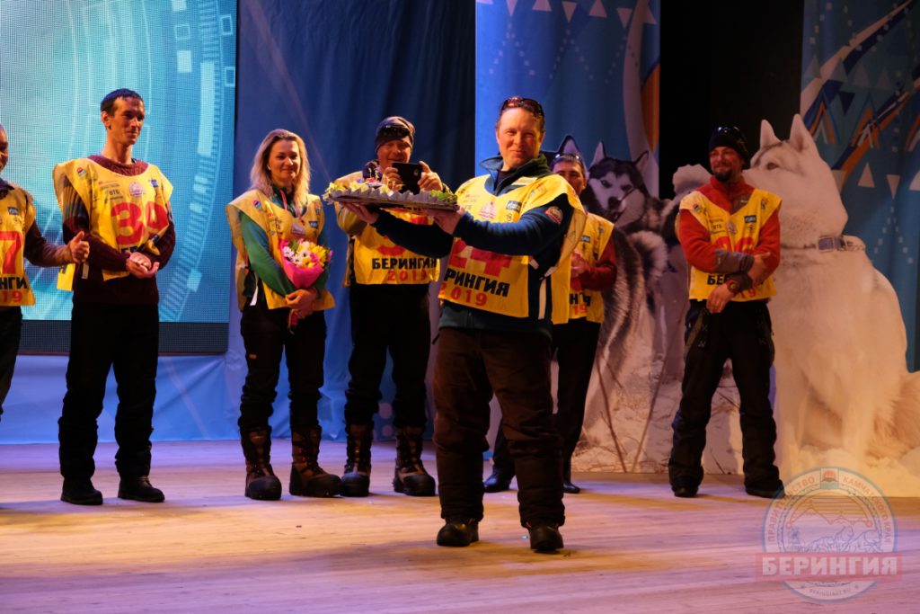 На церемонии чествования победителю гонки Вячеславу Демченко вручили запечённую красную рыбу. Эту традицию заложили в 2016 году на финише гонки в селе Тиличики Олюторского района. И традиционно её все вместе съедают участники Берингии-2019.