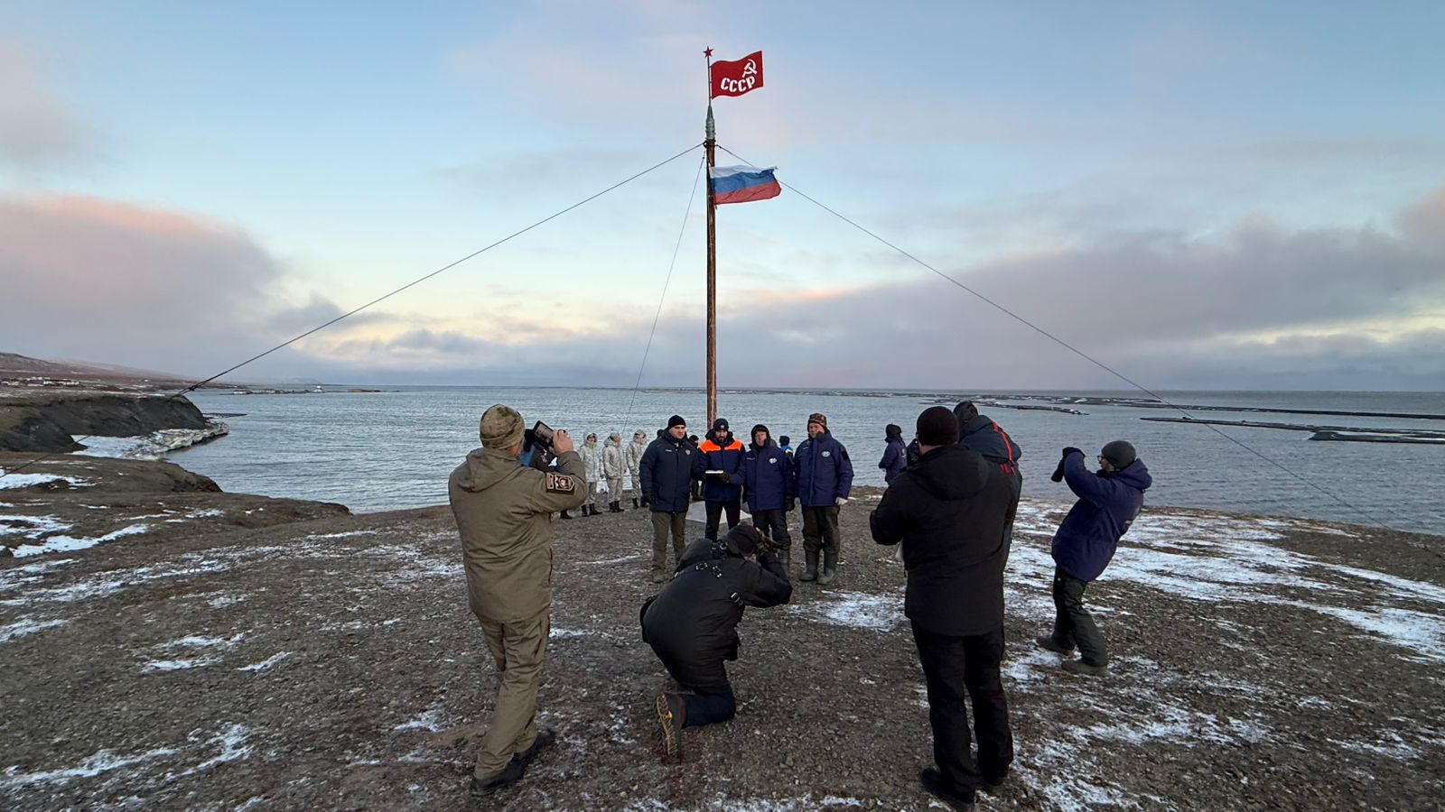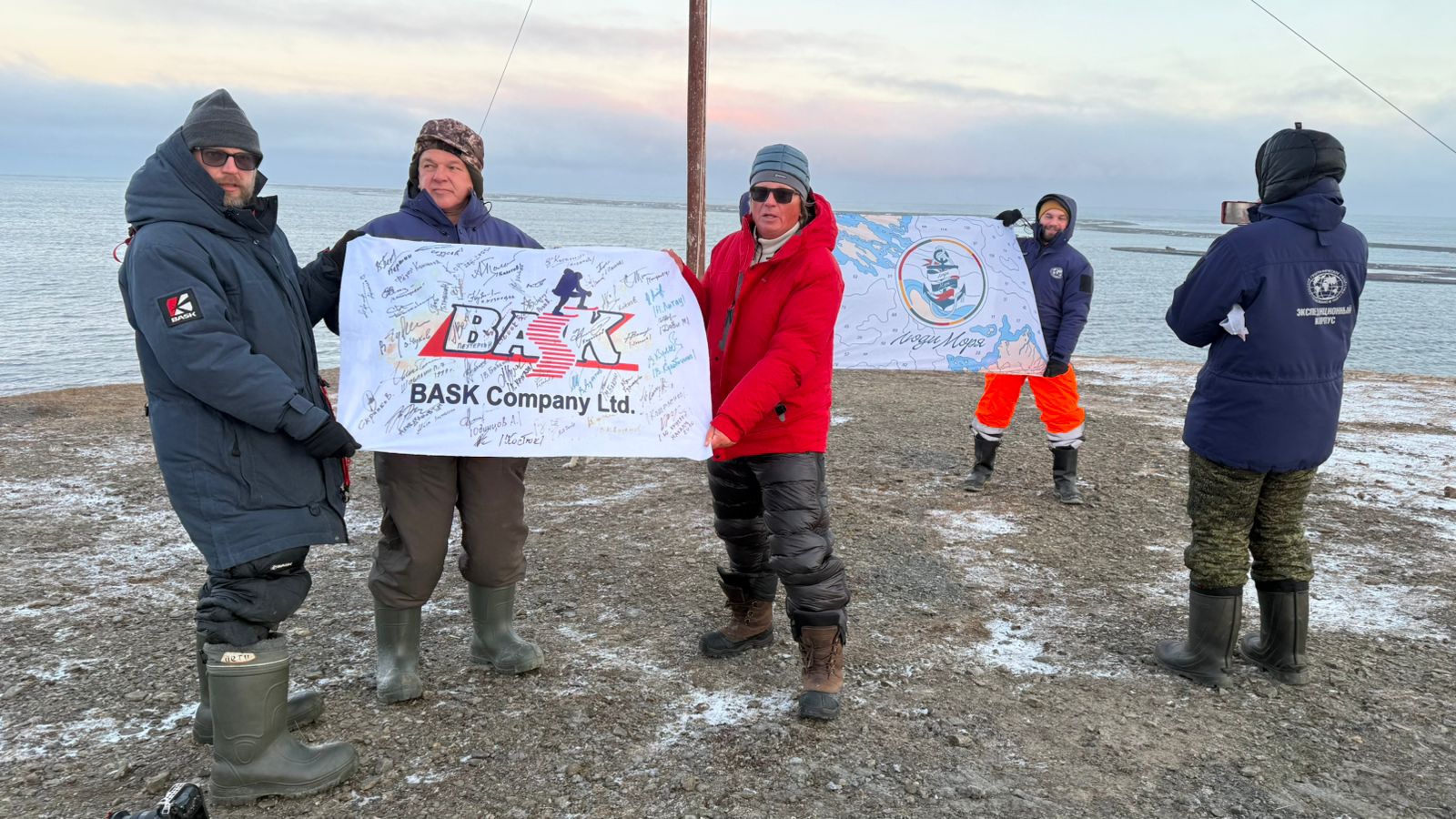 Исторический флаг БАСК побывал на высочайших горных вершинах мира. И вот теперь поднят на острове Врангеля – над водами Северного Ледовитого океана, в сердце самого северного природного заповедника России. Сделали это замечательные ребята – режиссер-документалист Леонид Круглов и его творческая команда, которая прямо сейчас ведет непростую видео-хронику для будущего фильма под рабочим названием «Вселенная белого медведя», посвященного Арктике, ее бесконечной многогранности и незыблемой вековой стати*. «Знаю лично больше половины людей из списка (список подписантов флага – ред.)», – сказал Л.Круглов, когда мы обратились к нему с идеей развертывания флага на церемонии закладки новой капсулы времени. И тут же согласился выполнить почетную миссию.