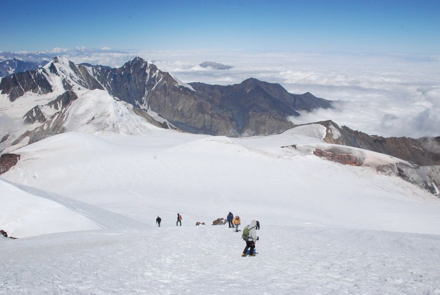 С рассветом выходим на Казбекское плато. Погода чудесная, на небе ни облачка. К 8 часам выходим на седловину.