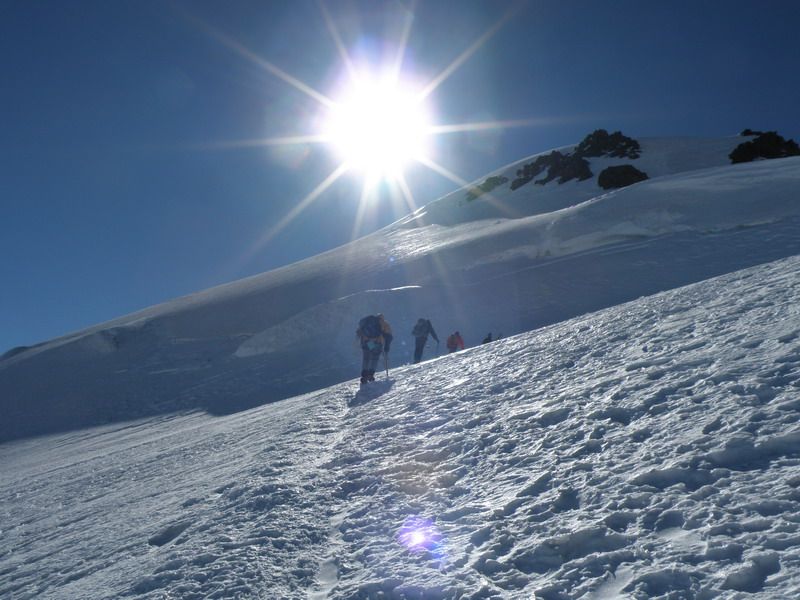 Выйдя на ледник мы увидели группу, поднимающуюся к базовому лагерю и последовали за ней. Пройдя по леднику мы вышли к контрфорсу. Прокинув перила начали подъем.