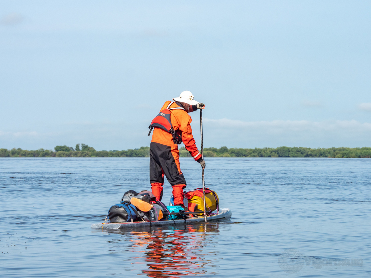 Отважный путешественник ночевал на затопленных островах, радуясь, что паводок защищает его от диких животных. Напомним, что в прошлогодней летней экспедиции Максиму уже приходилось встречаться с медведями (на его sup-борде до сих пор видны следы когтей любопытного хищника), а в прошлом путешествии к заливу Счастья на лыжах его сопровождали волки. Тем не менее, огнестрельное оружие спортсмен с собой никогда не берет, – только нож. Ружье, по мнению Макса, «не дает погрузиться в дикую природу, где человек способен выжить и без убийства животных». «Надо, чтобы проснулись инстинкты предков», – убежден исследователь.
