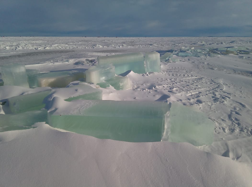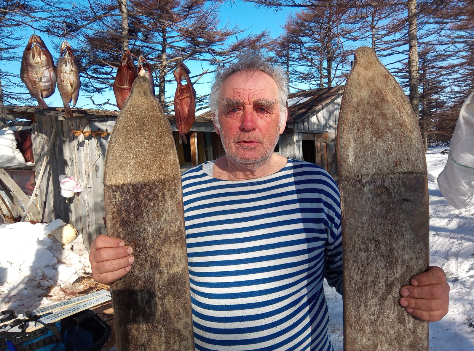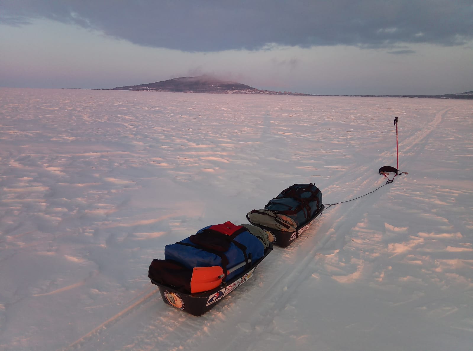 «Шел по дуге до мыса Погиби на Сахалине. Получилось 11 километров, пришлось немного обогнуть открытый фарватер. Напрямую идти нельзя, открытый фарватер это – гигантская промоина, огромным кинжалом вклинивающаяся в пролив Невельского. Хорошо, что дуга небольшая, напрямую было бы километров восемь. Повезло, что пролив встал ровно. Гладкий, снег глубокий, но есть хороший, задутый ветрами за зиму, наст, который держит лыжи. На мысе Погиби есть метеостанция, где меня встретил начальник Владимир Степанович Якушев, который меня помнит еще по 2019 году, когда я переходил с материка на Сахалин на сапборде. Он определил меня в гостевую комнату с печкой, спальным местом и всем необходимым. Я бросил вещи и пошел прогуляться, заодно поискать халцедоны, сердолики, маленькие агаты, которыми обычно густо усеяны песчаные берега мыса. Однако, долго гулять не пришлось, – пошел снег, и началась очень хорошая пурга. Сварил яйца, которыми меня угостил Владимир Степанович, открыл дверь слить воду, и меня тут же всего облепило снегом. Я даже растерялся, выронил кастрюльку, яйца раскатились по всем сугробам, ветром их гонит, пришлось ловить. Обычное дело превратилось в целое приключение. Сидел и думал, насколько мой план на следующий день продолжить путешествие реален. Уже хочется двигаться дальше к цели.